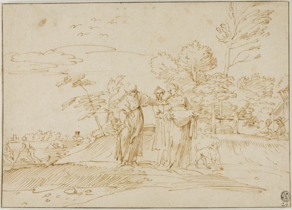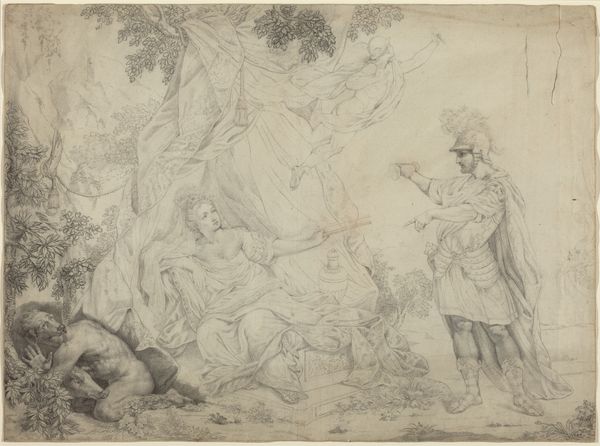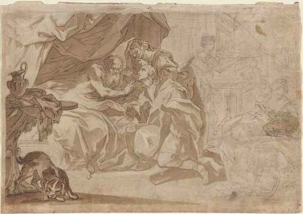 Editor: This drawing, "Odysseus' Ankunft bei den Phäaken_ Odysseus fleht Nausikaa um Hilfe an", its creator is unknown, seems to depict a scene from Homer. The use of ink on paper is delicate, almost fragile, emphasizing the vulnerability of the figures. What can you tell us about its materiality in the context of the artwork? Curator: From a materialist perspective, the drawing offers a window into the economics of art production during the Baroque period, as well as being a good medium to reproduce other existing artwork by a different medium. The relative affordability of paper and ink, compared to say, oils or frescoes, suggests this may have functioned as a study for a larger work, a way for the artist to work through the composition and details, or, even more intriguingly, a readily marketable piece aimed at a different kind of buyer. Notice the penmanship; how the pressure and speed of the strokes communicate form and emotion so economically. What do you see in this piece? Editor: The figures on the left being in or near what seems like a lavish, ornamental cart. It does strike me that the figures almost contrast sharply with the detail on the wheel. Curator: Precisely. That level of detail wasn't casually chosen. Could it be a conscious decision reflecting social strata or wealth distribution? It presents an exciting material contrast: ink, humble and reproducible, depicts figures arguably displaying signs of their societal stature. How are these two separate sets of materiality engaging? Editor: So, you’re suggesting the work critiques, through its materials and the detail included, the socioeconomic conditions of the time and the lavish lifestyles enjoyed by some versus the reality for others? That's an interesting angle. Curator: Exactly! Consider, too, the labour involved – both in the mythical scene and the artist’s painstaking work. Every visible material tells a story beyond the depicted narrative. Editor: I hadn't considered the relationship between the medium itself and its potential social commentary. This gives me a completely different appreciation for Baroque drawings. Curator: Indeed, by analyzing materials and production, we gain a much richer understanding of the social and historical forces at play in even seemingly straightforward historical or mythological images.