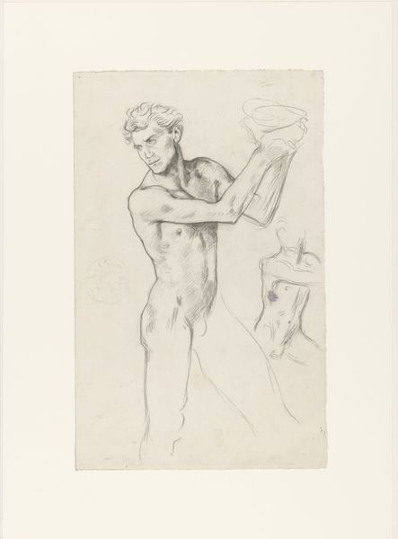 Curator: What a compelling sketch! Lemoyne's "Bacchus," created around the 1730s, employs a rather economical pencil on paper to capture the god of wine in what appears to be a moment of ecstatic, or perhaps inebriated, contemplation. It resides here with us at the Minneapolis Institute of Art. Editor: It does give an impression of intoxication, doesn’t it? The pose is off-kilter, the line work is dynamic but hazy…a potent immediacy pervades this Baroque nude study. I wonder, how does the image operate culturally, offering classical themes with accessibility? Curator: Exactly. Bacchus, or Dionysus, is eternally caught between the classical ideal of divine perfection, and the very human, very visceral experience of being inebriated. The Baroque loved to explore these tensions, allowing for an emotional resonance that transcends mere religious dogma. The sketch is far more about the experience than any stuffy myth. Editor: A key point, that this captures a sensory world with more at stake than religious observance alone. By the 1730s, such mythological depictions held increasing socio-political sway, moving from papal decrees to aristocratic diversions and theatrical subjects. So, is Bacchus truly divine here, or is he just another noble at Carnival? Curator: A clever thought, and you make a crucial point! Consider, Bacchus here isn't presented with overt godlike accoutrements - no ivy crown, no thyrsus is immediately apparent. It subtly reframes the mythological for an increasingly secular elite, blurring god and human. A cultural dance! Editor: The image offers itself openly to shifting interpretations: a god, a drunkard, or just a convenient symbol? Lemoyne captured something mutable within a historical moment ripe for renegotiation of what symbols signified in the public imagination. I now have another layer to consider about this era, these images. Curator: And on that slightly destabilizing note, I think our time is complete. Thanks for sharing a stimulating cultural reading!