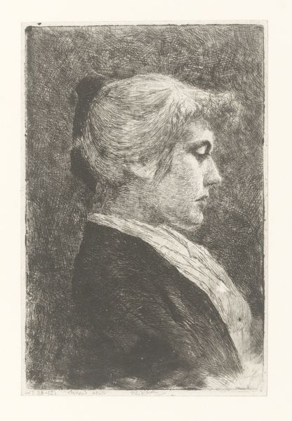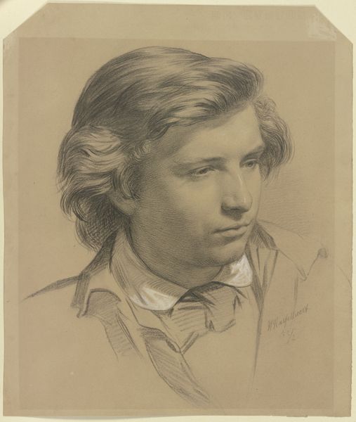 Curator: Before us is a drawing from around 1852: "Bildnis des Malers Julius Hamel als Schuler des Städelschen Institutes im Profil nach rechts" which translates to "Portrait of the Painter Julius Hamel as a Student of the Städelsche Institute in Profile to the Right". Editor: The subtle shading gives the whole piece such a gentle, almost melancholy feeling. It’s a striking contrast of delicate details against a more roughly rendered background. Curator: Indeed. What’s fascinating is the tension between the artistic training Hamel received at the Städelsche Institute and the political context of mid-19th-century Germany, still grappling with the aftermath of the 1848 revolutions. Were these portraits also about affirming social identities or even a way to express certain allegiances through representation? Editor: It's compelling to consider the production of portraits, especially student portraits, as sites of labor. The choices of graphite, chalk, and charcoal—relatively inexpensive materials—suggest a focus on accessibility for aspiring artists. We're looking at the material underpinnings of artistic training. Curator: Absolutely. Think about the social position of someone like Julius Hamel within the Institute. His inclusion in this series reinforces the institution’s authority to bestow identity. Were those admitted given advantages based on gender, social standing, or family connections? What narratives were explicitly excluded? Editor: The economy of line also tells a story. Notice how certain areas, like the hair, are rendered with incredible detail, drawing our eye there first. It directs our attention and signifies where the value—both material and aesthetic—is concentrated within the artwork. Curator: Examining the artist's choices invites questions about access, exclusion, and the systems that elevate certain narratives while silencing others. The male gaze has been so normalized that portraits by, and of, men rarely provoke questioning or inquiry into the politics of looking, or issues around representation. Editor: In considering "Bildnis des Malers Julius Hamel", it feels like it’s reminding us that art historical context is as much about brushes, pencils, and paper as it is about broad sociopolitical issues of its time. Curator: Exactly, engaging in art is always interwoven into existing, complex narratives around race, gender, power, and more.