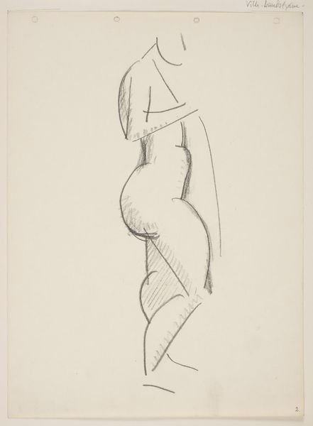 Vilhelm Lundstrom rendered this sketch, Stående nøgen kvinde, profil til højre, draperi i hånden, in graphite on paper. Lundstrom was a Danish modernist painter known for his reduced, cubist-inspired forms. The cultural context of the early 20th century, marked by changing views on the female body, likely influenced this sketch. The woman is seen in profile, nude save for a drape she holds in her hand. Lundstrom simplifies the female form to geometric shapes, but at the same time, he highlights her sensuality through the curves of her breasts and belly. The gaze is directed toward the model’s pregnant form. Here, identity and gender intersect to disrupt traditional representations. Lundstrom refrains from idealizing the pregnant female form, presenting it instead with a sense of realism. He captures a sense of vulnerability, and invites us to reflect on the experiences and social roles of women.