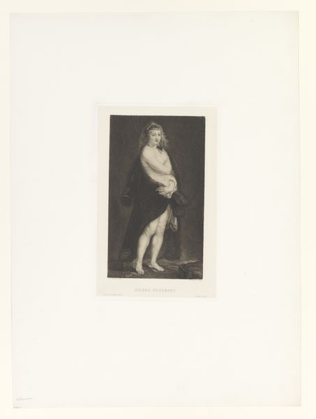 Curator: Let’s turn our attention to Joel Ballin’s “Apollon med plektret,” which roughly translates to "Apollo with the Plectrum", made sometime between 1822 and 1885. What do you think of this rendering? Editor: Well, Apollo here certainly cuts a striking figure. Immediately, I see the stark contrasts – it’s all shades of grey. A solemn grandeur emerges from such restricted tonal choices, no? Curator: Indeed. Ballin’s focus here on Apollo – god of music, light, and healing – presented nude and in such classical style really emphasizes the...material reality that art wants to turn itself into. Here is the sculpture through the filter of the printmaker’s labor, after all! The idea of divine beauty, put into the real and often dirty work of art. Editor: Yes, I see what you mean. Looking closely, you begin to realize how physically demanding engravings are: carving all those precise lines... Ballin labored at creating Apollo from a different raw material. The shift really gives this idealized form such surprising and humble humanity. Curator: Exactly! In the neo-classical period, there was, of course, a certain fascination with reproducing Greek and Roman sculpture. The question remains though; How do we reconcile the godlike with the man-made? I think, what are those conditions that permit art? How does culture affect our labor? Ballin takes our Greek subject and adds, what could be described as a Danish aesthetic. Editor: Thinking about "labor," I noticed something I never usually think of – is that the music made on Apollo’s instrument would’ve surely provided accompaniment to physical labour: rowing songs to cadence manual exertion and weaving or knitting to accompany fireside toil! Now we’re far away from the purity of sculpture but maybe a bit closer to the essence of art… Curator: A compelling observation. He looks rather caught in time: he plays a divine music for the world, which speaks to more human concerns like everyday life. Editor: Right. What Ballin crafted speaks to the inherent link between the ideal and the material – he really made art into itself. Thank you for highlighting all the important things we may find in "Apollon med plektret," an exceptional, almost dream-like depiction that continues to haunt my ideas surrounding classical art.