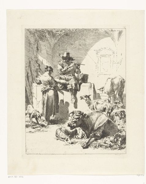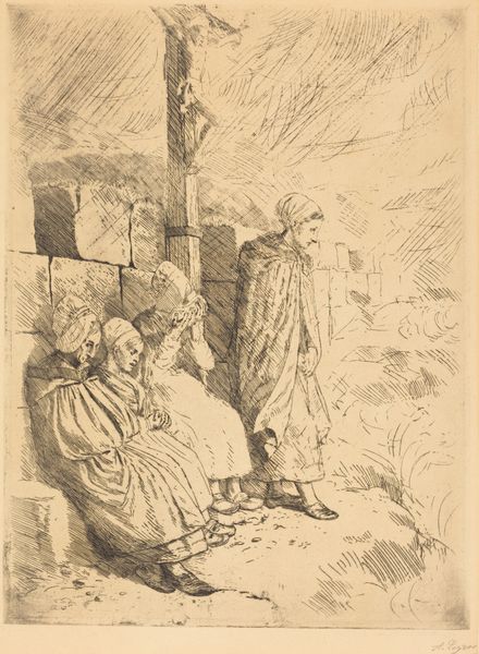 Curator: Ah, Rembrandt. Looking at this print, “Christ and the Woman of Samaria,” made in 1657, hanging here at the Rijksmuseum, I can feel the weight of centuries just... dissipate. It feels immediate, like a whispered secret. Editor: It's interesting, that immediate feeling. To me, it feels so carefully constructed, this etched narrative laid out on paper. What’s striking is the labor behind each tiny stroke of that etching needle; the almost industrial process in getting the master's art to the masses. It begs the question: What even constitutes the "original"? Curator: That labor, that careful crafting—it’s a form of devotion, isn't it? He's imbuing every line with such concentrated emotion. You can almost see the woman’s heart opening in the flickering light. He’s letting the light touch what needs to be illuminated within her. Editor: Yet what I see highlighted most are the everyday items - the well where they meet, the buckets used for their daily lives. It almost seems Rembrandt wants us to consider that it’s not a grand theological battle, but instead it happens through routine work, labor, and ordinary conversations. Curator: Absolutely, it is profoundly intimate. Even the landscape surrounding them feels like a participant in this subtle, transforming exchange. The etching captures that fragile moment when beliefs shift. What are you thinking about, those other people, watching this conversation? I like to see how he brings so many lives, those of observers too, into the center. Editor: That focus is clever: look closely, you see the wear and tear on the very copperplate itself becomes another layer of "reality," highlighting that this spiritual awakening is deeply interwoven within our material conditions. The image and object itself shows time, doesn’t it? Curator: You are so right. Even as we stand here observing, reflecting, our understanding shifts; our experience of this etched scene alters our reality too. Isn't that what art does, ultimately, change everything around us. Editor: Definitely. It reveals how our interpretation hinges not only on spiritual contemplation, but also an active consideration of our social context, the labor involved, and our individual consumption. Every piece invites new insight.