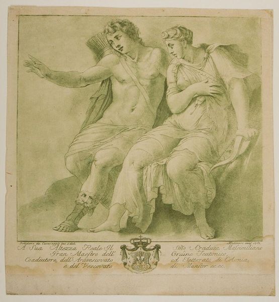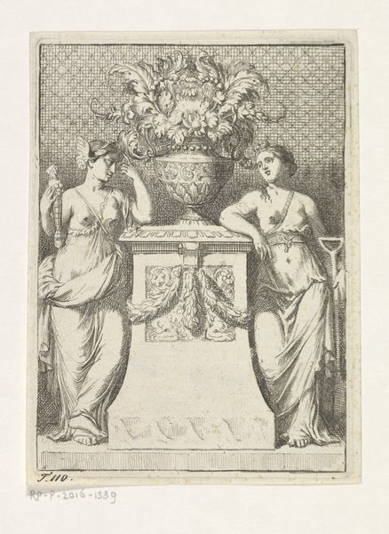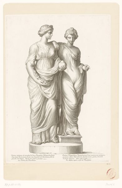 Editor: This is Etienne Baudet's "Statues of Two Nymphs." It's fascinating how he renders the texture of marble in print. What strikes you most about the process of its creation? Curator: It highlights the tension between the unique, hand-carved sculpture and its mass-producible representation. Consider the labor involved in both the original carving and the etching process. Editor: So, the print democratizes the artwork, making it accessible, but also transforms its value? Curator: Precisely. It shifts from a precious object to a commodity, raising questions about the art market itself and how value is assigned. Editor: That's a great point. I hadn't considered how the shift in materiality impacts its reception. Curator: Material and mode are intertwined. It prompts us to consider who has access to art and how its dissemination shapes our understanding.