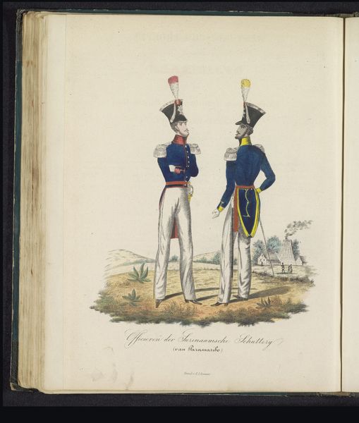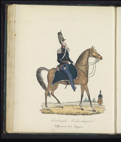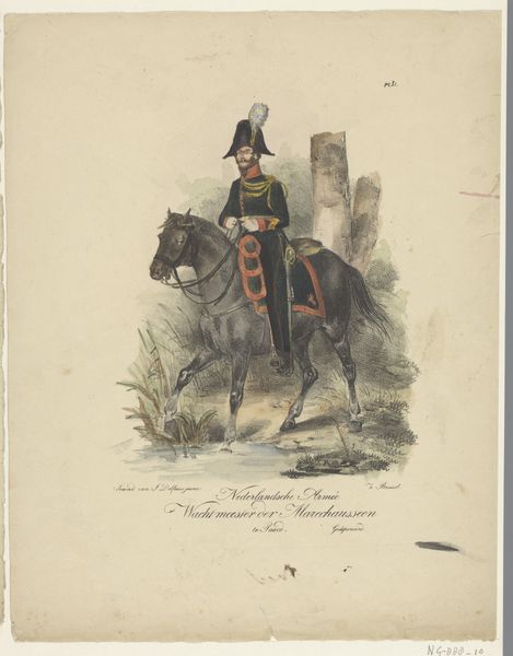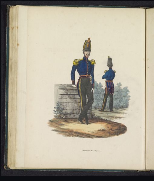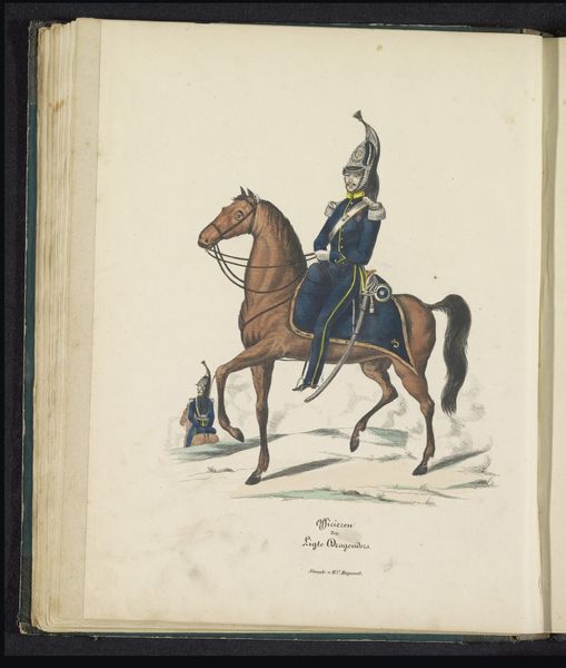 Editor: This is "Uniform van de officieren van de lansiers, 1845" by Louis Salomon Leman, made with drawing, coloured pencil and print. The bright colours against the white background are quite striking. How would you approach analyzing this artwork? Curator: As a materialist, I'm interested in unpacking the processes of production here. The combination of drawing, coloured pencil and print suggests a reproduction, perhaps for distribution. Who would have had access to it? How would this image of military authority function within the social and political context of 1845? Editor: So you're more interested in the "how" and "why" of its creation than the subject matter itself? Curator: Exactly. Think about the coloured pencil; consider the pigments used, where they were sourced. This was a period of intense colonial extraction; did the making of this image rely on those systems? How does the medium contribute to the message? Editor: I see your point. I hadn't really considered the raw materials having their own history. What do you mean by "function"? Curator: How was this work intended to operate within society? Was it a form of propaganda? Was it meant to create a feeling of nationalism? Remember the artist and workshop conditions were shaped by socioeconomic relationships of this historical period. It becomes more than just a portrait; it becomes an artifact embedded within a complex network of production and consumption. Editor: That is definitely a perspective shift for me! I’ll need to consider the economic factors, like trade routes of specific materials, rather than just aesthetics going forward. Thanks! Curator: It enriches the experience, doesn’t it? Seeing beyond the surface allows us to engage with the artwork's historical and social significance in a meaningful way.