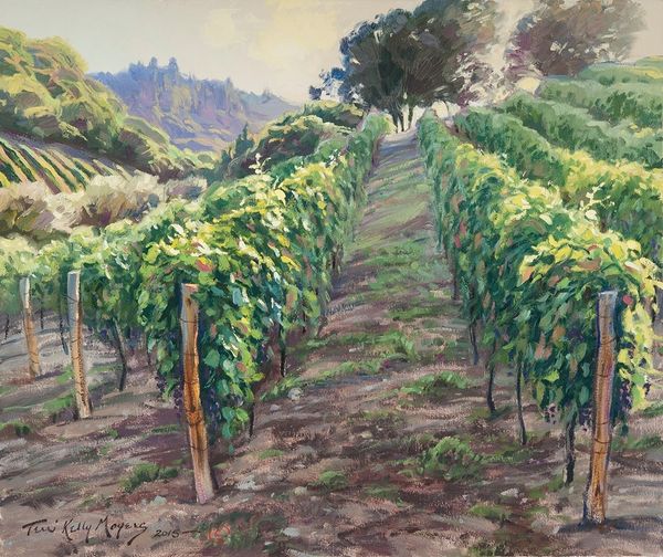 Editor: So, this is "Cabernet" by Terri Kelly Moyers, painted in 2015. It's oil on… something (laughs) – probably canvas or board, right? Anyway, it feels super warm and almost nostalgic, like looking at a forgotten photograph. All those grapes! What do you see in this piece that I might be missing? Curator: Ah, "Cabernet"! Yes, Terri's work always brings me a particular joy. For me, it's the dance between the realistic depiction of the grapes and leaves and the almost abstract way she's applied the paint, the lovely impasto. She’s capturing a memory more than a precise botanical study, wouldn't you agree? It makes me think of the way a vineyard smells at the end of summer, earthy and sweet all at once. Do you pick up on that tension between the real and the remembered? Editor: Definitely, now that you point it out! It’s like the fuzzy edges are softening the reality of it. It reminds me of memories of my grandmother's garden. Curator: Exactly! Art’s like that, isn't it? It’s a mirror reflecting our own experiences back at us. And the way she focuses so closely on the grapes, almost cropping them… it feels intimate, like a stolen moment. What does that intimacy evoke for you? Editor: I guess it's like she’s inviting us into her own personal vineyard, a private, delicious space. I love that. Thanks, that really shifted my perspective on it. Curator: My pleasure. Every artwork holds countless stories, and the fun is finding which one resonates with you. It's a constant discovery, for both of us!