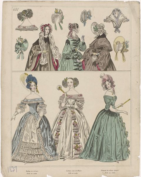 This is an anonymous print from 1840, titled Townsend's Monthly Selection of Parisian Costumes. It depicts the height of bourgeois fashion, when dresses served as a canvas for aspirations of taste and class. Consider the role of women in the 1840s, largely confined to the domestic sphere, where appearance was paramount. Each bonnet and gown speaks volumes about the wearer’s status and identity within a rigid social hierarchy. The puffed sleeves, delicate bonnets, and elaborate embellishments weren't merely aesthetic choices. They were signifiers of wealth and respectability. The artist's personal experiences and beliefs remain a mystery. Yet, their work offers us a glimpse into the lives of women who navigated a world of strict gender roles and societal expectations. It's a world where clothing became a carefully constructed language of identity. The print offers an emotional connection to these women and prompts us to reflect on the complexities of identity, fashion, and power.