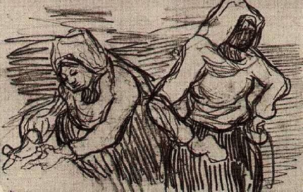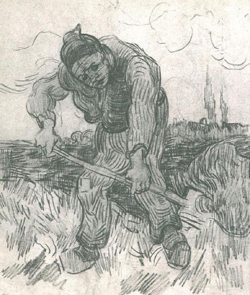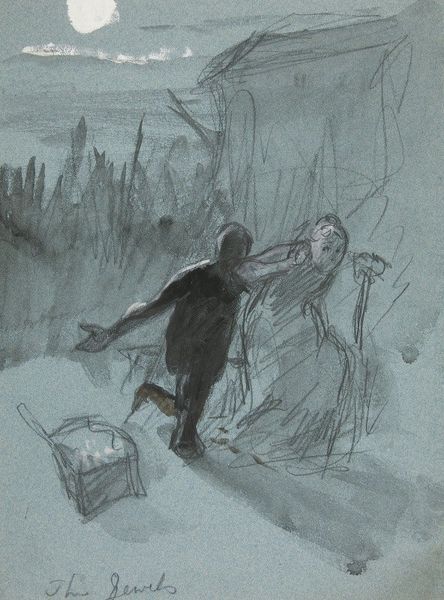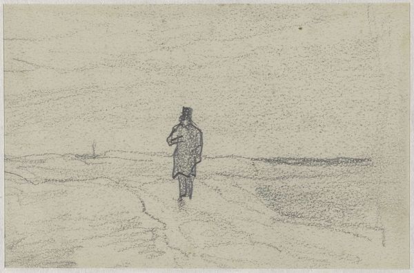 Curator: This compelling graphite and pencil sketch, "Peasant, Walking with a Wheelbarrow," was created by Vincent van Gogh in 1885. Editor: My immediate impression is of solitude and heavy labor. There's a palpable sense of the peasant's weariness conveyed through those deliberate, weighty lines. Curator: Indeed. Van Gogh consistently depicted the lives of working-class people, seeing a kind of raw dignity and enduring spirit within them. The wheelbarrow itself could be seen as a symbol of the peasant’s burden and the constant labor involved in survival. Editor: Absolutely, the wheelbarrow almost becomes an extension of the figure— an emblem of the systemic exploitation and back-breaking agricultural toil they endure. It’s fascinating how he makes this solitary figure almost monumental, which underscores the sheer force it took to endure the rigid socioeconomic conditions of that era. Curator: Notice how the simple materials enhance that raw feeling too: The monochromatic scheme feels particularly poignant because it mimics the grim realities of their lives. It evokes a time when a vast underclass powered much of Europe, often unseen or ignored. Editor: And there's also that subtle but noticeable upward direction in his gait, a quiet form of defiance or resolve despite his conditions. It speaks to the quiet strength cultivated in resistance to oppressive societal forces. Curator: One of Van Gogh’s goals was to use art as a medium through which the lower classes could be given both voice and form. He imbued these everyday figures with a heroism often left for more esteemed subjects. Editor: It highlights how something like rural, agrarian hardship is actually part of our collective European heritage – reminding me how artistic production plays an important role in unveiling our shared, often ignored past. Curator: I find that his dedication to portraying the realities of agrarian life, without romanticization, emphasizes the genuine resilience of the peasantry, and the cyclical nature of their existence. Editor: Ultimately, this sketch forces a necessary confrontation with a past of labor exploitation. The work evokes both an awareness of its continued existence, even if it morphs over time and region, as well as inspiration to strive toward fairer futures.