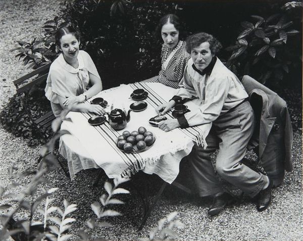 Curator: The intensity of the gaze in Rosalind Solomon’s "New York," taken in 1987, is startling. Editor: Absolutely, you are confronted by a fierce protectiveness, a wariness, from this man with arms crossed, while an older couple lingers in the background. There is a definite moodiness here—a black and white study in discomfort, wouldn't you agree? Curator: Solomon's skill here lies in using a deceptively simple photographic approach to elicit complex emotional reactions. We're drawn into considering power dynamics, perhaps family histories and generational shifts, made potent by that intense look. What is he protecting, or who? Is it the people standing in the background? Editor: Maybe from being observed themselves? I find it very stagey, too, somehow. I mean, it's clearly a constructed scene. Look how the light separates them. It brings me back to all those awkward family portraits where nobody smiles but the parents are smiling and hoping everyone appears "normal". Do you get the sense it's a response to that tension and discomfort? Curator: I think it's both, and Solomon's portrait style, deeply rooted in documentary photography, gives that staged quality an edge. These aren’t posed celebrities; these are everyday people presented with a rawness and directness that is unusual. This approach challenges the romantic idea of the candid family portrait. What does showing all mean here? The black and white photography lends this timeless quality as well; the picture could be almost anytime in the mid-20th century! Editor: That's true. Black and white flattens time, but it also distills emotion somehow. It becomes about the shapes, the light, the inherent contrasts. Makes you consider the light—almost theatrical, the contrast makes you aware that things have been pushed for an effect. Curator: In this photograph, Rosalind explores a lot about public roles that family members might have; she makes us question the familiar comfort associated with images of parents and grandparents as kind and generous elders! Editor: Well, Rosalind certainly gave us food for thought, as ever. A moment frozen in time but echoing something deeply rooted within all of us.