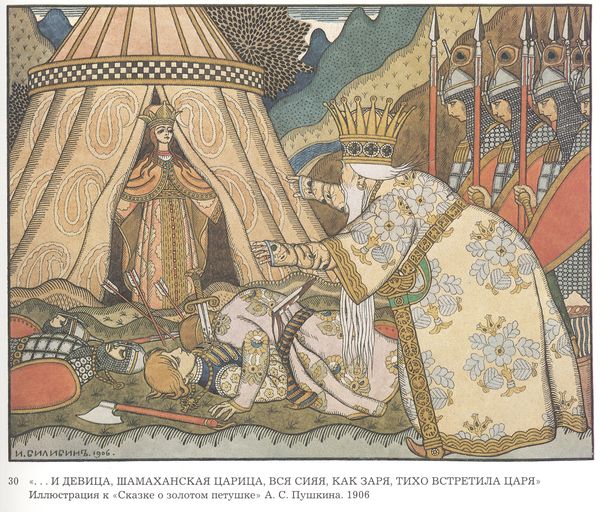 Curator: Ah, yes, this vibrant scene. It’s Ivan Bilibin’s 1906 illustration for Alexander Pushkin's poem, “The Tale of the Golden Cockerel.” Editor: Well, the first thing that jumps out is the level of detail—I mean, look at those riders! It feels both incredibly ornate and somehow...flat. Like something woven. Curator: Woven...that’s interesting. Bilibin was heavily influenced by traditional Russian folk art. Notice how he uses defined outlines, creating almost a tapestry effect? He really elevated what might have been considered craft. Editor: Right, because those flat planes—it's almost like he's deliberately showing off the layering of color. What’s striking is his application of watercolor and how it mimics printed textiles; the materiality implies this connection to artisanry. You could almost see these repeated on fabric, wallpapers or book covers. Curator: Precisely! And consider Pushkin's poem itself - it’s a satire, cloaked in folklore. So Bilibin's artistic choice—celebrating traditional crafts while illustrating this fantastical story— it deepens that layer of meaning, you know? It suggests the beauty and deceptive simplicity of cultural narratives. Editor: That makes sense. There’s this fascinating dialogue happening between medium, material, and narrative tradition. He doesn't shy away from representing opulent details like garments or war accessories but I do wonder what considerations in terms of printing techniques influenced this painting... Did Bilibin work closely with printmakers or directly create print plates to have tighter control over final material outcomes? Curator: The illustration style does have the clarity of intention and precision associated with print production, so it would not surprise me. Editor: Looking closer I see now the rhythmic march, the layers and layering—a deliberate echoing of mass production through careful art making. Curator: A perfect encapsulation, wouldn’t you say? Bilibin truly captures how material culture elevates not only folklore but lived experience into visual delights. Editor: Exactly! It feels far less static, seeing those intentional layers between form, production, and storytelling at play here.