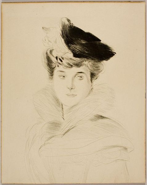 Curator: Ah, here we have Paul César Helleu's portrait of Constance Herbert, second Marchioness of Ripon, a delicate pencil drawing. What's your first take? Editor: There's an almost ethereal quality to her, wouldn’t you agree? A certain quiet strength too; she holds your gaze, even in this fleeting sketch. It whispers of the constraints placed upon women in her position and era. Curator: Fleeting is a perfect word! Helleu was all about capturing a sense of momentary beauty, like trapping a butterfly in a net of lines. His work often feels so spontaneous, as if he simply picked up his pencil and *poof*, there she is! Editor: And that spontaneity, of course, is carefully cultivated. I mean, think about the power dynamics here. Helleu, a man, capturing the likeness of a woman from an incredibly privileged social position. It brings up questions around agency, visibility... who controls the narrative, even in a seemingly simple portrait? Curator: Oh, absolutely! But also consider the almost confessional nature of the sketch itself. The rawness! There is a direct line, it feels like, straight to the woman beneath the marchioness. Though those hairstyles are definitely saying something different, aren't they? Like sculpted clouds! Editor: Indeed. The hairstyle and high collar frame her face in a way that both elevates and confines. It mirrors, in many ways, the restrictive garments and social expectations placed upon upper-class women, doesn’t it? The artifice is palpable, a construction. Curator: Right, and yet... those eyes. They feel like they’ve seen more than they should have, know more than they let on. Perhaps Helleu was tapping into something deeper, or maybe I'm just projecting my own romantic notions onto a sketch! Editor: Perhaps we both are, a bit! But that’s the beauty of art, isn't it? This dance between the artist’s intention, the subject's reality, and our own interpretation through the lens of history and our contemporary sensibilities. Curator: Exactly! This simple pencil sketch is such a potent distillation of beauty, class, and the quiet drama of being. Editor: A glimpse, truly, into a complex life, cleverly captured on toned paper with only a bit of light pencil work. Curator: It definitely makes you wonder about Constance Herbert. I might just have to delve into this a bit more.