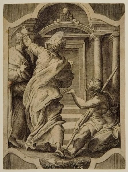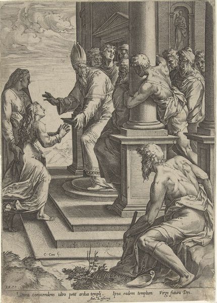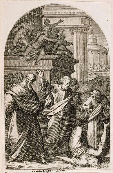 Curator: This is Giulio Bonasone's "Saint Paul Preaching," a striking engraving from around the mid-16th century. Editor: It feels so charged, doesn’t it? All those lines creating this incredible tension, like a gathering storm about to break. Curator: The density of those etched lines certainly contributes to the drama. Bonasone masterfully uses hatching to create volume and shadow, particularly on Paul's robe and the faces of the listeners. Editor: And the composition itself—the oval frame, the strong vertical of the column… it all focuses our gaze directly on Paul’s raised hand, that gesture of authority. Curator: Absolutely. It draws your eye to the heart of the message. There’s a real sense of contained power here, a feeling that something momentous is unfolding. Editor: Seeing it like this, it's much more than just an illustration. It’s a glimpse into a soul on fire, trying to ignite others.
