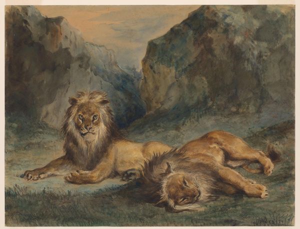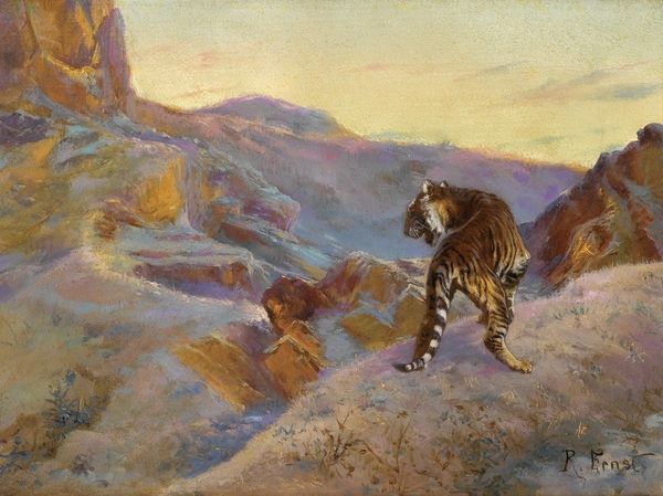 Curator: This is Richard Friese’s oil painting, "Hunting Lions". Editor: It’s making me think about manifest destiny, you know? That feeling of claiming a view, this panoramic expanse. The lions almost feel like symbols of an untamed power, poised on the edge of everything. Curator: Friese, though not extensively written about, was a significant figure in animal painting. Consider the power dynamics implicit in that very genre. Humans representing animals, often in the context of hunting or domination... it says a lot about our relationship to the natural world. Editor: Totally! And the palette here, it's so subdued. I mean, you expect these big, dramatic strokes of color in an animal painting, but it’s all very muted browns and greys, like the scene is whispering rather than roaring. Curator: Absolutely. Note how Friese uses the landscape—this rocky terrain—to create a stage for the lions. The painting highlights tensions between animal agency and imposed environments. The viewer is asked to consider the precarious position animals have historically held when confronted by humans in ever-expanding settlements. Editor: Makes you wonder what they’re thinking. Are they hungry, are they sizing things up? Or are they just taking a breather? It’s that sliver of mystery, right? Friese drops us into their moment, and then it’s up to us. The painting offers only this fragment, this stolen glimpse into the world of its wild subjects. I feel a kinship there. Curator: Considering how so many depictions of wildlife have actively advanced problematic imperial narratives, I always question whose gaze informs our readings of paintings like this. Is it possible to strip away layers of prejudice and perceive an unfettered image? Perhaps not. But engaging with that question directly feels ethically sound to me. Editor: Beautiful. I love how we began with the vista and ended at questions of prejudice. All from a painting of a pair of big cats! Thanks, Friese, for getting the ball rolling today. Curator: Indeed. A reminder that every artistic depiction has both context and consequences.