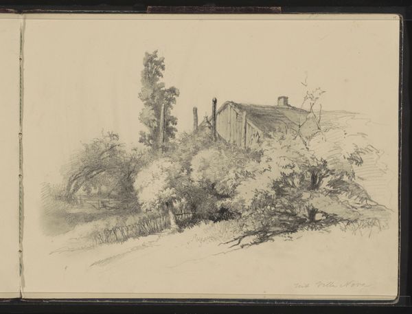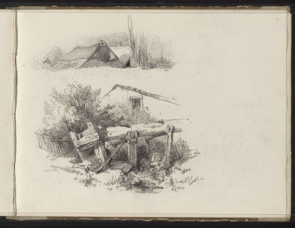 Maria Vos created this drawing, "Hut met een rieten dak," using pen in gray ink, capturing a rustic thatched-roof hut. The composition, dominated by diagonal lines, creates a dynamic yet informal atmosphere. The use of gray ink gives the scene a monochromatic quality, emphasizing texture and form over color. Vos masterfully employs hatching and cross-hatching to delineate the hut's rough texture and the surrounding foliage. The diagonal lines of the roof contrast with the more vertical lines of the supporting beams, creating a visual tension that prevents the scene from appearing static. Note how Vos plays with light and shadow, using darker lines to suggest depth and volume, particularly in the thatched roof and wooden structure. The sparseness of the foreground draws our attention to the detailed rendering of the hut itself, which invites contemplation on the simplicity and transience of rural life. The sketch is not just a depiction of a building but an exploration of form and texture. This work destabilizes any romantic readings of rural life, presenting it through a formal study of structure, light and shadow.
