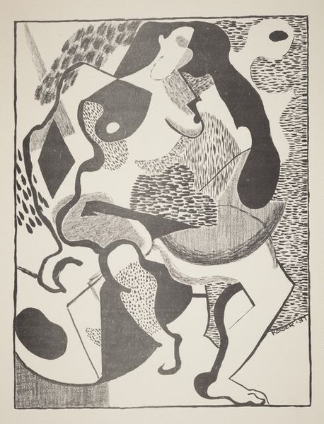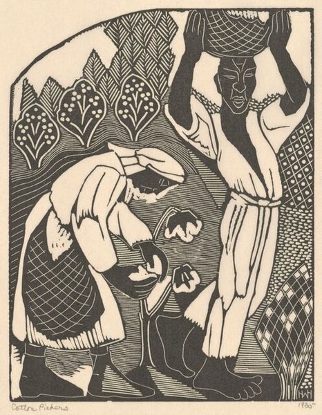 Editor: So, this woodcut print, called "Milleniums," was created by Helen West Heller in 1946. There is such a captivating juxtaposition of agrarian and industrial imagery here. What socio-political themes do you find represented? Curator: I see this print as reflecting the post-World War II anxiety around industrial advancement. Heller juxtaposes a seemingly Edenic, agrarian lower register, occupied by humans and farm animals, with a rapidly industrializing world in the upper register, all overseen by what seems to be a large commanding, central figure holding spheres marked with unrecognizable characters. Note the tractors and streamlined vehicles contrasted with the more organic forms and themes of nature and life below. Editor: The large figure seems quite powerful...and perhaps a little imposing? Is this Heller critiquing power structures? Curator: Absolutely! Heller was deeply invested in social justice. How might the public reception of this artwork be different during a time of rebuilding post-war versus the pre-war period or during wartime? Editor: I imagine post-war there was greater focus on the rebuilding and newness that the industrial age brought. Prior to and during wartime, perhaps more focus on what could be lost...or taken by outside forces? Curator: Precisely! Heller’s art engages with this complex dynamic; what did the promise of "progress" mean, and for whom was it meant to deliver? It's vital to consider that Heller's work emerged within very specific contexts shaped by rapid social and technological change. Editor: This makes me rethink what I initially saw as merely a contrast in styles. Thanks for highlighting that socio-political aspect! Curator: The most compelling artworks often make us reflect on broader social dynamics of a specific time, encouraging us to engage in a richer public discourse around both history, and our present, social environment.