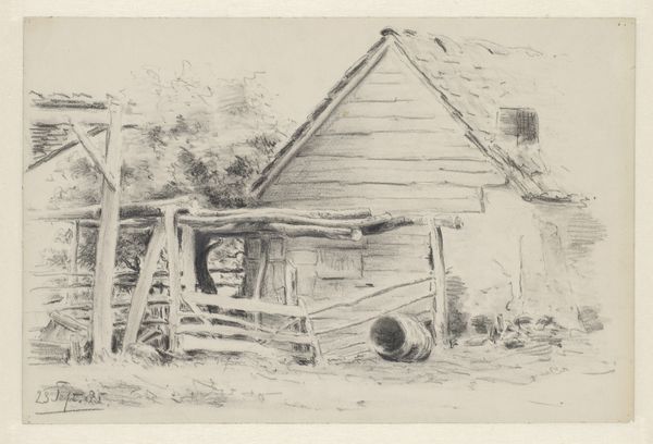 Editor: Here we have Sybrand Altmann’s pencil drawing, "Schutting met een deur op een achterplaats", created sometime between 1840 and 1843. The first impression is one of hidden worlds and unseen stories. What draws your eye when you look at this work? Curator: It's interesting how Altmann uses such simple lines to evoke a sense of depth and history. For me, it’s the doorway. A doorway, you see, is always a potent symbol. What does it mean in this context, do you think? What sort of passage does it signify? Editor: Maybe the transition from public to private, or from the known to the unknown? I’m intrigued by how much is left unsaid in the sketch, like a secret glimpse into 19th century life. Curator: Precisely! Consider the symbolism of the barrier itself. Fences, walls…they delineate space, defining ‘us’ and ‘them.’ The gate, slightly ajar, invites a crossing of boundaries, but hesitantly. Do you see the implication of liminal space, the threshold? It suggests both exclusion and possibility, depending on the cultural lens. Editor: I never thought of a fence having so much to say! Looking again, the stark white space on the right compared to the textured detail of the shed makes the boundary even more striking. It is all about the symbolism embedded in our everyday structures. Curator: Absolutely. Everyday structures often unconsciously represent broader power dynamics within a community, even an entire society! Think about how different materials are used to signal different social stratifications: What memories and traditions are attached to a simple wooden fence versus, say, a tall brick wall? It also begs the question what kind of continuity our familiar views, places and memories bring across time and how they transform. Editor: I hadn’t considered the drawing on that deeper, societal level before. This really makes me appreciate the rich layering embedded in what seems, on the surface, like just a humble backyard scene. Curator: Indeed. This work shows that even in what might seem a simple backyard scene there lies many more stories of how memory persists through even the most mundane objects.