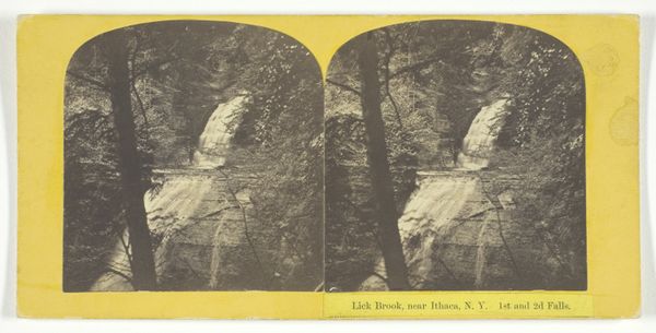 J.C. Burritt created this stereograph card of Fall Creek, Ithaca, N.Y., capturing the front entrance to a tunnel. The photograph presents a dual image, each side revealing the same scene from a slightly different angle, creating a three-dimensional effect when viewed through a stereoscope. Notice how the composition draws you in, with a wooden boardwalk leading into the dark mouth of the tunnel. Dense foliage frames the path, creating a contrast between the structured walkway and the wildness of nature. The texture is rich, from the rough-hewn planks of the path to the leafy overgrowth. The image plays with the signifiers of nature and artifice. The tunnel, a man-made structure, is almost swallowed by the natural surroundings, suggesting a dialogue between human intervention and the unyielding force of nature. Consider how this tension might reflect broader philosophical concerns about humanity's place within the natural world. The stereograph challenges our perception of depth and space, offering a layered viewing experience.