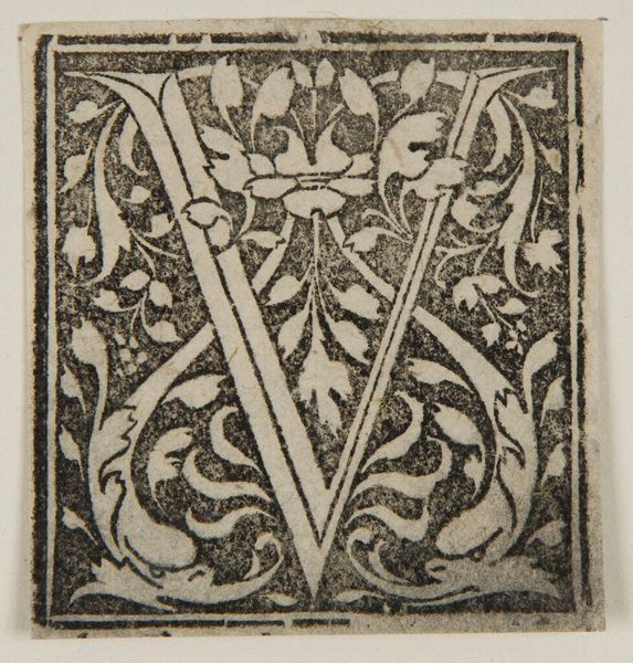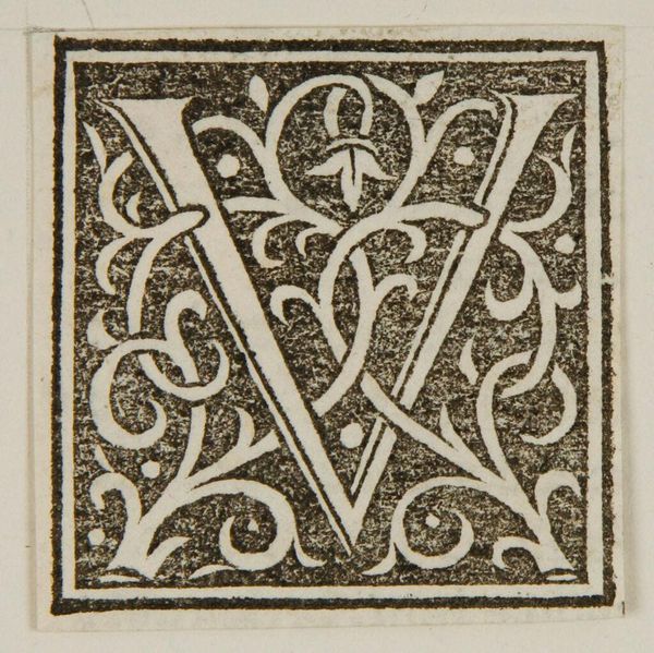 Curator: Here we have "Letter V," a fascinating example of anonymous printmaking housed here at the Harvard Art Museums. Editor: You know, the first thing that strikes me is its intricate, almost claustrophobic design... like a secret garden contained within this letter. Curator: Right, the vegetal motifs intertwining with the letterform invite a discussion about the relationship between text and nature, reflecting perhaps a broader societal engagement with botanical studies. Editor: It feels like a collision of worlds, the rigidity of language blooming into organic shapes. I wonder, was this meant to be part of a larger text, a kind of rebellion in illumination? Curator: It's very possible. In the context of early printmaking, the embellishment of initial letters often symbolized a yearning for pre-printing aesthetics, especially within religious and philosophical texts. Editor: Ultimately, for me, it is an evocative piece—a reminder that even the most functional components can hold beauty and rebellion. Curator: Indeed, seeing it through that lens allows us to rethink the legacy of printmaking and how even the smallest gesture can carry significant cultural weight.