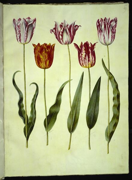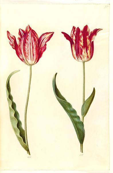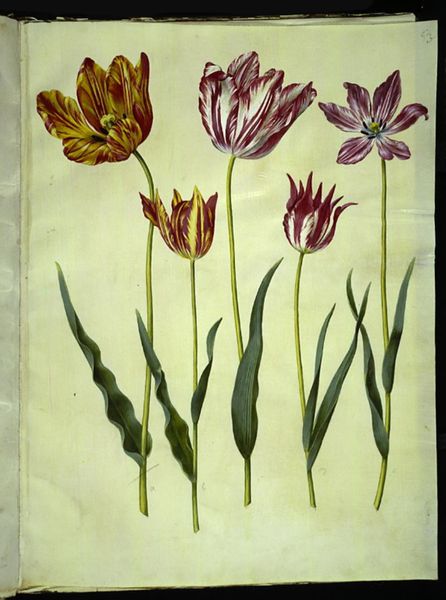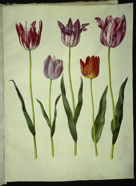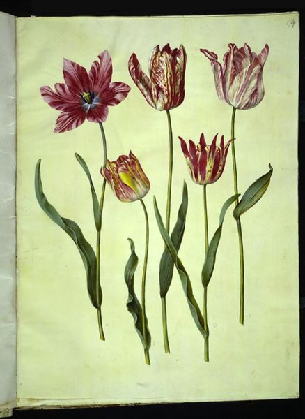 Editor: Here we have Hans Simon Holtzbecker's "Tulipa gesneriana (have-tulipan)", likely created between 1649 and 1659 using watercolor and gouache. I'm struck by the delicate rendering of these tulips; the artist really captured the texture of the petals. What aspects of its composition and execution do you find most compelling? Curator: Indeed. Let us first note the emphasis on line in the careful delineation of each tulip. The artist employs watercolor to build subtle tonal variations, especially in the petals where gradations suggest volume and light. This systematic observation reflects a developing empirical sensibility during the Dutch Golden Age. Observe how Holtzbecker creates harmony and contrast: thin stems with organic curves support flamboyant flowerheads. Consider how light glances on their surfaces through thin washes of color. Do you note anything in terms of the space they occupy? Editor: The arrangement feels almost scientific, each bloom presented individually rather than as a natural arrangement. The blank background further isolates the subjects. Curator: Precisely. By doing so, Holtzbecker isolates them into compositional elements with his choices regarding form and hue. It is fascinating that with mere applications of colour he directs one’s reading and engagement. Would you say his intention seems more about art or more about documentation? Editor: Initially I would lean toward documentation; the piece appears as a botanical record. However, considering the skillful and considered formal decisions it becomes difficult to overlook its status as a piece of fine art, beyond its botanical purpose. Thank you; that has given me a completely different way of reading this work. Curator: Agreed. Ultimately, Holtzbecker presents a careful exercise in seeing and recording form. It exemplifies how technique and perspective meet to reflect, through representation, that particular moment in the Golden age.