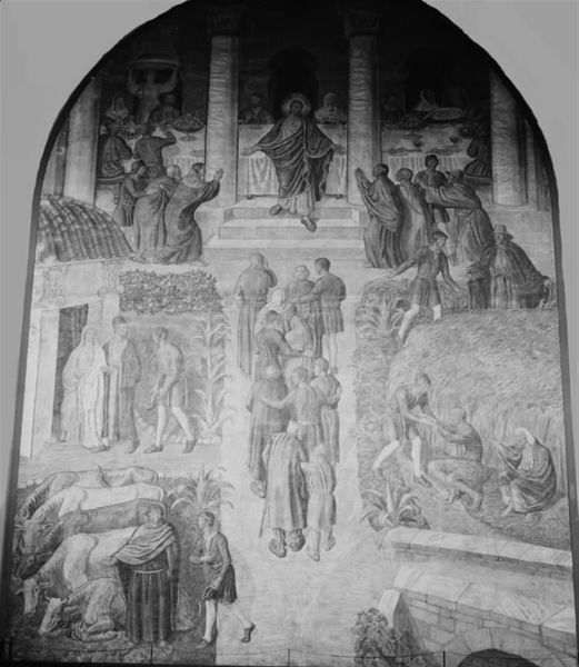 This is a tapestry of 'The Last Supper', made by Michiel Coxie, and is now located at the Metropolitan Museum of Art. Its monochrome hues and grand scale immediately command attention. The composition is arranged with the central figures of Jesus and his disciples seated around a long table. Coxie uses linear perspective to draw our eyes to the vanishing point, subtly placing emphasis on the figure of Christ. The arrangement destabilizes the traditional Renaissance focus on Christ as the central vanishing point, suggesting a more complex interplay of power and representation. Coxie employs a semiotic system of gestures and expressions, imbuing each character with symbolic weight. The reaction of each apostle is deliberately crafted, indicating the narrative tension, which reflects broader cultural and philosophical concerns around faith, betrayal, and mortality. The monochrome palette and dense textures challenge fixed meanings, engaging with new ways of thinking about space and perception. The absence of color serves not merely as an aesthetic choice but as a potent signifier, prompting ongoing interpretation and re-interpretation of the artwork's purpose.