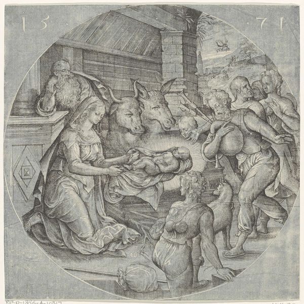 Editor: Here we have Chrispijn van den Broeck’s 1571 engraving, "Besnijdenis van Christus in de tempel," housed in the Rijksmuseum. It's incredible how much detail he packed into this relatively small print! It definitely captures a very dramatic, solemn mood, even in monochrome. What strikes you most when you look at this? Curator: Well, as a materialist, I immediately focus on the process. Think about the labour involved in creating such an intricate engraving. The physical act of cutting those lines into the metal plate, the tools used, the skill required – it's all so tangible. Editor: So you're thinking about the physical act of creation and what that meant? Curator: Exactly. And how this print then becomes a commodity, circulated and consumed within a specific social and religious context. Who was buying this? What purpose did it serve? Was it devotional, decorative, or something else? Editor: That's a different perspective than I initially considered. So it's less about the religious symbolism and more about the labour that was exchanged and what its existence reveals about the society? Curator: The two are intrinsically linked. Consider the material value of a print like this versus, say, a painting. It was inherently more accessible. This makes us consider its reach and the types of patrons or audiences it attracted. Were the prints produced in multiples, expanding their sphere of influence and contributing to the standardization of artistic representation? What can those distributions of materials tell us? Editor: I see what you mean! I was caught up in the subject matter, but the medium itself tells a different story about production, dissemination, and consumption. Thank you. Curator: And that shift in focus enriches our appreciation of the work! It is a product shaped by particular material conditions, economic realities and social structures.