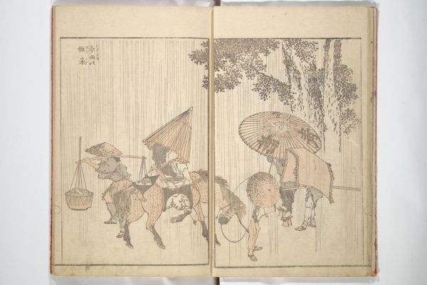 This print, *Shōno—Driving Rain*, was created by Utagawa Hiroshige. Here, line and form work together to convey the immediate experience of a rainstorm. Note how the slanting lines dominate the composition, suggesting not just rain but also movement and the force of nature. Consider how Hiroshige uses the landscape—the hill, the trees—to frame and intensify the human struggle against the elements. The diagonal of the hill confronts the verticality of the rain, and the stooped postures of the travelers enhance this interplay. It is as though their bodies are mirroring the angle of the rain itself. The visual tension created by these formal choices evokes a sense of empathy for the figures. The artist employs a restricted palette of colors to set the mood. Here, the cool blues and greens contrast with warmer earth tones. This contrast emphasizes the dreariness of the weather, which is typical of Japanese *ukiyo-e* prints. The way Hiroshige orchestrates these elements underscores the print's power, not just to represent a scene, but to embody a feeling.