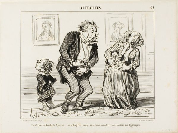 This lithograph, "Family with Health Complaints," was made by Honoré Daumier. Lithography is a printmaking process using a flat stone or metal plate, a greasy medium, and acid. Unlike engraving, where the image is incised, lithography allows for a more fluid, drawing-like approach. Daumier was a master of this technique, using it to create satirical images of 19th-century French society. The strong lines and areas of shading, characteristic of lithography, enable the artist to emphasize the caricatured features and emotional intensity of the figures. Notice how the lines capture the tense exchange between the parents and children’s apprehension. This print was produced for a mass audience, and distributed in a journal. Daumier's choice of lithography speaks to his commitment to social critique and the accessibility of his art. By employing this printing technique, his commentary on class, health, and domestic life could reach a wide audience, blurring the boundaries between fine art and popular culture. For Daumier, materials and making were always about social context.
