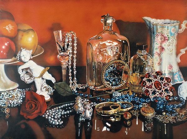 This is Audrey Flack's painting, Queen, and it's a trip. The super-real, almost aggressively precise airbrushing is the first thing you notice. You might not expect this level of detail, but, you know, art's full of surprises. The thing that's so cool about it is this odd combination of control and wildness. It's like Flack's saying, “Yeah, I can paint reality, but I'm going to mess with it a little.” Look at the way everything is layered up, almost collapsing together. The queen of hearts is front and center, but what about the rose? And those dewdrops, painted like hyper-real jewels. They're so tactile you feel like you could reach out and touch them. The whole thing feels like a party, a really weird, slightly decadent one, with all these objects crammed together, each telling its own story. It makes me think of those Dutch still lifes, only turned up to eleven. This isn't just a painting, it's a conversation, a dare.