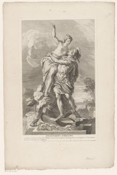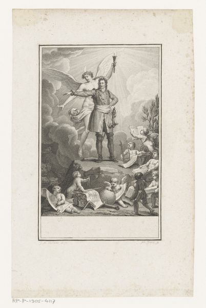 Curator: Ah, here we have a title print, dating from 1679 to 1728, entitled "Titelprent met twee engelen en draperie," or Title Page with Two Angels and Drapery, created by Jean-Baptiste de Poilly. A very elegant engraving, wouldn't you say? Editor: It feels like a whisper—delicate lines, muted tones. It makes me think of forgotten secrets and half-remembered dreams. So ornate, almost dizzying in its details, and there's a painter's palette—broken! That really speaks to me! Curator: Interesting! It’s an engraving, so naturally a printmaking process. The inscription on the drape essentially describes the making of drawings from life in the Académie by F. Verdier, then translated into print by de Poilly. A collaboration of artisanal labor! Editor: Right, the artisanal process itself. It’s beautiful how the labor intensifies the overall visual experience, the image of the academy filtered and processed into something so, well, precious. Do you think the image is making a statement on artifice, as much as it is the "real?" Curator: It does raise some key questions around reproduction and distribution of artistic knowledge, especially regarding access for aspiring artists outside royal circles. That fallen mask suggests to me the toppling of tradition. But I think this work affirms, as much as challenges, the structure. Editor: Mmm, tradition! Something is being covered, maybe, but at the same time, made to be looked at, to be revered? The angel has this curious, almost wry look... Curator: A common trope, of course—cherubic figures, drapery. But yes, a beautiful encapsulation of its period’s aesthetic. The means of production directly influence the work. A well-designed piece of artist promotion of this kind highlights its very consumption as something to admire and emulate! Editor: Agreed. I can definitely appreciate how materials can shape our interpretations! It adds such another layer. Thanks for opening my eyes! Curator: Anytime! Thinking about production enriches our perspective on this, and other, artworks!