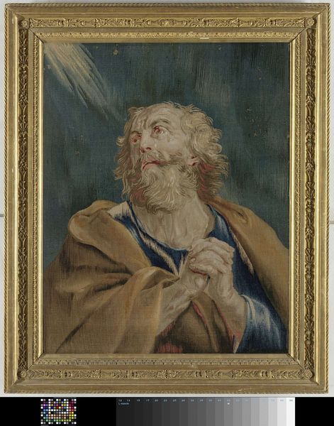 Curator: Before us hangs Jean-Étienne Liotard's "Self-Portrait with a Long Beard," painted in 1752. Editor: Well, my first thought is this man is remarkably confident, or at least projecting confidence, especially with that expansive beard and penetrating gaze. Curator: Confidence is interesting to consider here, given Liotard's meticulous attention to detail. Notice how each strand of the beard is carefully rendered, catching light and shadow. There's a hyperrealism, almost, which elevates the artist's very persona to a study of light and texture. Editor: That detailed realism does feel self-aware. During the Enlightenment, the self was under intense scrutiny; artists often used self-portraiture to broadcast certain ideals. I'd wager he's deliberately crafting an image of the wise, accomplished artist—almost a sage. He is flaunting this unconventional style, particularly the beard, at a time when powdered wigs reigned. Curator: Exactly! And that brings us back to the formal aspects. The asymmetrical composition—the off-center placement of his figure, the way the canvas he paints is only suggested—it directs our attention intensely to his face and, crucially, his hand holding the brush. This act of painting, the making of the artwork itself, becomes the subject. Editor: It is quite striking, this red jacket against the muted background, how the eye goes straight to the face as the painting contrasts against it. Was he consciously breaking from some of the artistic conventions, asserting a unique position amidst the societal rules for painters? I mean, who sees such a glorious beard amidst Rococo and says this is the real look? Curator: The contrast between the almost photorealistic face and more sketch-like rendering of the background adds another layer of complexity, a visual equivalent of an artist presenting his skills versus subtly hinting at their process of making. The academic skill versus what is not to be shown… a choice in this context? Editor: Thinking about his position, exhibiting or making this piece was more than documenting self; it made a statement, embedding social commentary right into its texture. Curator: Ultimately, this "Self-Portrait" becomes a fascinating blend of artistic declaration and skilled demonstration of technique. It certainly resonates across time! Editor: Yes, this piece invites so many levels of viewing, it is more than meets the initial reaction!