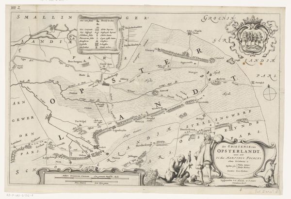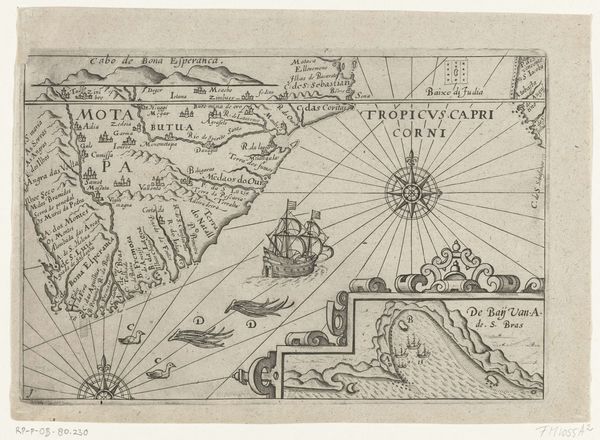 This map of the coast near Piombino during the siege of 1650 was made by an anonymous artist. The composition is visually dominated by the geographical rendering of the Piombino coastline and its surrounding waters. Note how the meticulous lines detail both the topography of the land and the ships at sea. The map’s structure divides space into zones of representation, contrasting detailed coastlines with stylized open water. The linear quality, evident in the neat hatching indicating land elevation and depth, brings us to think about semiotics where signs are used to present an idea of place and spatial relationship through cartographic language. Consider how the interplay between factual representation and symbolic encoding reflects the period's understanding of territory and power. The map therefore functions not merely as a tool for navigation but also as a complex cultural artifact.