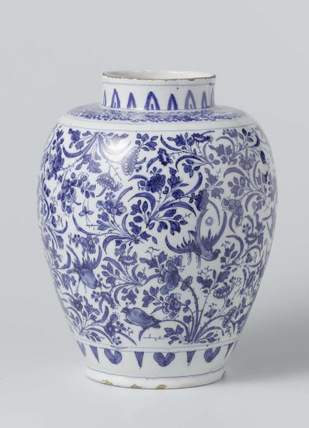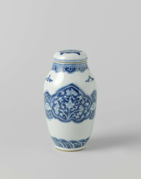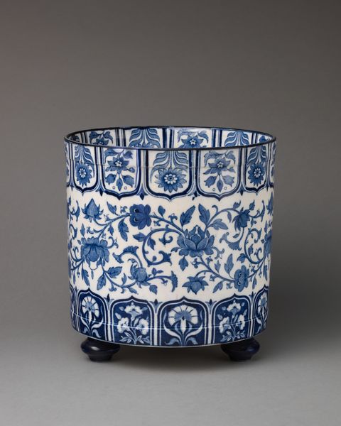 Curator: Wow, this garden seat really stops you in your tracks. Editor: It does, doesn't it? A surprisingly grounded energy for something so ornamented. Makes me think of taking a pause, really settling down amidst a chaotic world. Curator: Well, let's unpack some context. This piece is titled "Octagonal garden seat with lotus scrolls", dating from around 1750 to 1774, and comes to us from an anonymous maker. Right now it's held in the Rijksmuseum collection. It's crafted in ceramic, reflecting a period keen on blending artistry with practical design. Editor: Ceramic, right? And it feels much bigger somehow, the intricacy of the pattern pulls me right in and I just know that ceramic's smoothness will feel cool and grounding beneath my palm... Makes you wanna sink into it. But also, that octagonal shape gives it structure, a clear defined presence within whatever garden it occupied. The color is so calming. Curator: Precisely! These garden seats are so interesting within their history. This type of seating wasn't just for leisure; it signaled a cultivated space, a stage for displaying wealth and taste. The lotus scroll, especially, bears weight. In Chinese iconography, the lotus represents purity, enlightenment, peace, and the cycle of rebirth. Editor: Right, a seat not just for sitting, but contemplating the nature of being. I dig that! It almost becomes less about luxury and more about, about centering yourself in nature. It makes you imagine what kind of conversations bloomed while someone sat there amongst the real flowers. Or, better yet, what quiet observations did they have? Curator: A delightful imagining. What I find intriguing is that such highly crafted objects democratize notions of peace and contemplation. A mass produced item now brings these Eastern philosophies into garden design. It’s now accessible to, presumably, everyone who goes to visit it! It alters who may find rest. Editor: Mmm, makes me consider its legacy: sitting in peace and contemplating it even here and now! Like the rings rippling outwards in a pond, this artwork seems small, contained but... powerful. Curator: Indeed. The Octagonal Garden Seat prompts reflection on how material culture shapes access and distributes cultural touchstones, democratizing not only spaces, but concepts. It has truly left a legacy. Editor: Okay, so maybe a seat isn't *just* a seat... this time. Thanks, this was illuminating.