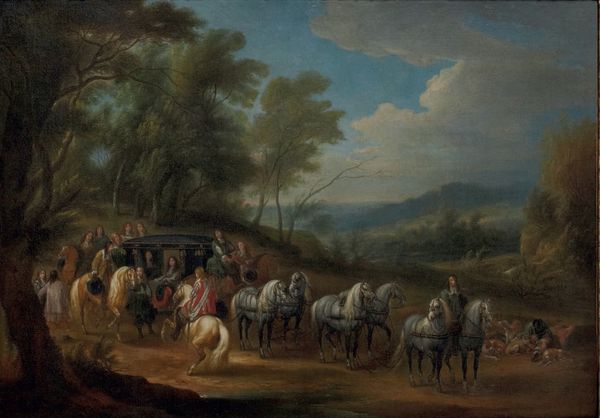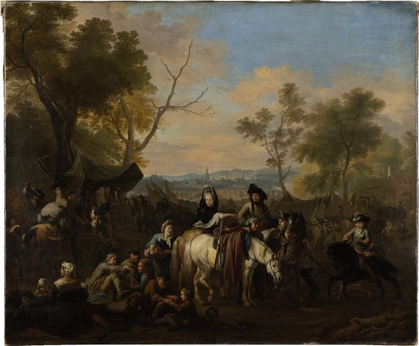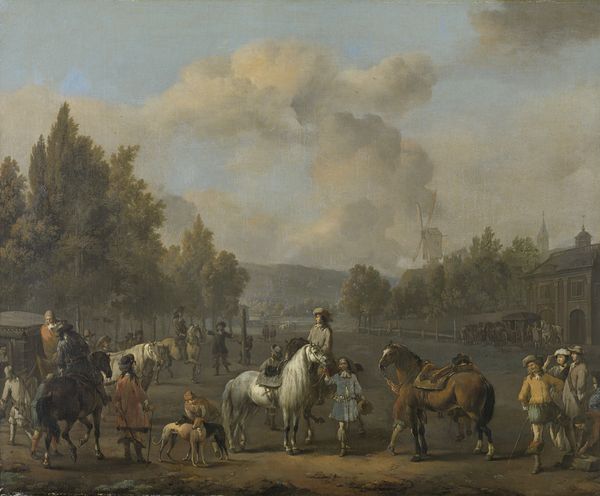 Adriaen van de Velde's "Ferry Boat" presents a tranquil scene with a complex interplay of light and shadow. Painted with oil on panel, its composition draws you into a serene landscape where figures and animals converge near a riverbank. The formal structure of the painting is built around a contrast between the dark, dense foliage on the left and the open, luminous sky on the right. Van de Velde uses this division to guide the viewer's eye, creating a balanced yet dynamic visual experience. Notice how the figures, carefully arranged in the foreground, serve as a bridge between these contrasting spaces, their poses and gestures subtly directing our gaze. The pastoral scene and the crossing can be viewed as a meditation on the passage of time, a reflection on human interaction with nature, and perhaps a symbolic crossing to a new beginning. The artist employs a semiotic language where the boat becomes more than just a vessel.