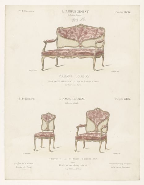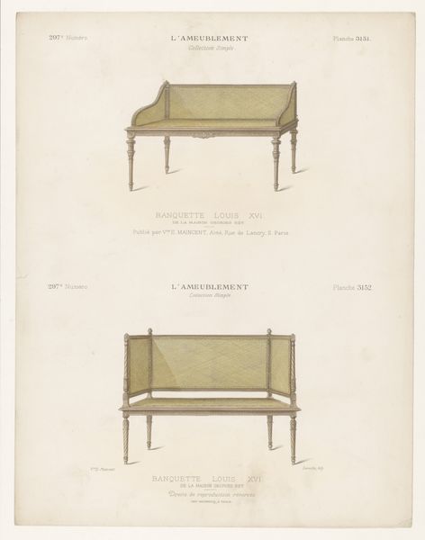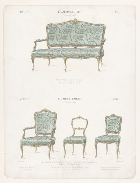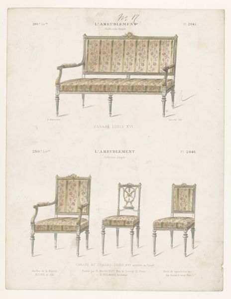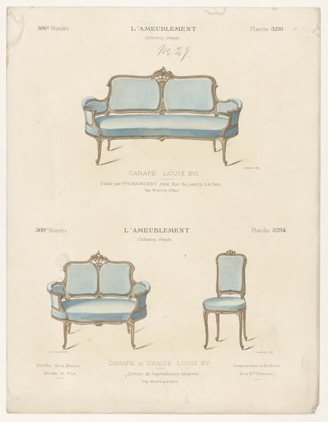 Léon Laroche created this print of furniture designs using line and watercolor on paper. The visual experience is dominated by symmetry and delicate, muted tones. The repetition of curvilinear forms and the detailed rendering of textures create an aesthetic of refinement, evoking a sense of classical elegance and order. The designs feature a sofa and chairs, each piece carefully delineated with precise lines that define their shape and structure. The arrangement on the page presents a structured comparison, inviting the viewer to consider the formal relationships between the different items of furniture. Each piece is framed within its own space. The subtle use of watercolor enhances the texture of the upholstery, with a cross-hatching pattern suggesting depth. This attention to detail not only highlights the material quality of the furniture but also reflects a broader cultural interest in aesthetics. The structured approach to layout and design, combined with the delicate rendering of form, communicates an appreciation for beauty and order.
