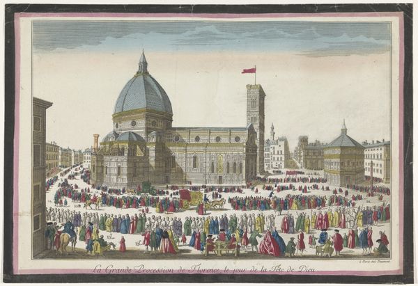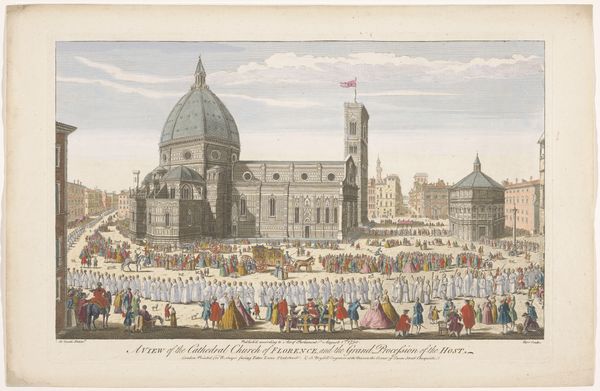 Curator: Here we have Georg Balthasar Probst's "Gezicht op de Dom te Florence," which roughly translates to "View of the Cathedral in Florence." Created between 1742 and 1801, this work offers a detailed depiction of the city's iconic Duomo. Editor: My first impression is how orderly the city looks. And look at all the people in the plaza! They're all figures of leisure and luxury, walking with intent. What do we know about who would commission an artwork like this? Curator: As a Neoclassical print, the architectural detail would be extremely important. Probst uses precise lines in this engraving to highlight the Duomo's imposing facade and the clean lines of Brunelleschi’s dome. Editor: Yes, but what cultural significance would a meticulous engraving of the Duomo have? What narrative did its image promote at the time? This artwork, with its seemingly impartial and architectural focus, feels deliberate and purposeful, given its historical context. It seems that every stroke has political undertones. Curator: Perhaps the clean architectural lines represented the order they hoped for at that time. Florence, even then, held deep symbolism. You’re right; this wasn’t just any cityscape. I think the clothing represents a wealthy merchant society, focused more on class and status, even in the absence of monarchy. Editor: That is where symbols start. What better image to show power and wealth than the church and surrounding gentry, each informing the other. This image would play to a cultural memory of Renaissance grandeur while reflecting more contemporary issues of identity, commerce, and control. I imagine that, to people outside of Florence, that red flag is almost like claiming the city for themselves. Curator: Your reading connects so many relevant ideas and I see those same political, cultural, and even psychological themes emerge. These kinds of prints can act as cultural documents—the ways perspective and scale were manipulated to support the story of an industrious class. Editor: The detail here isn’t simply aesthetic; it’s a construction of identity and ambition, caught within an engraving.