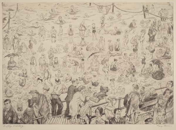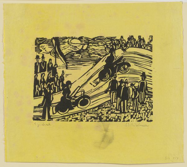 Curator: This is Pierre Alechinsky's 1967 linocut print, "Bird's Eye View of the Sea". Editor: It feels chaotic, a swirling vortex of blues against a stark white backdrop. The lines create a sense of restless energy, almost overwhelming. Curator: Indeed. Alechinsky, known for his association with the Cobra group, often infused his work with spontaneity and a calligraphic quality, moving away from rigid formalism and academic traditions. He was looking at ways of working against social norms that promote ideas around who and what can be accepted as worthy of visual space. Editor: The title suggests a detached, objective perspective, but the execution is so emotionally charged. The geometric forms are fighting for attention—do you think this tension represents something specific to its moment, perhaps anxieties around increasingly impersonal social systems? Curator: I see it as a more personal exploration of the subconscious, very typical of his era and artistic movement. The bird's eye view could be symbolic, indicating a yearning for detachment but, ultimately, the energy is far too overwhelming and internalized. And, while Alechinsky explored abstraction extensively, elements suggestive of natural forms, such as water, figures and faces are never truly abandoned. Editor: The medium, a linocut print, contributes to that nervous, raw quality as well. The gouged lines are thick and uneven, imbuing the scene with an unsettling vitality. This challenges the common definition of "abstraction" because, even as something formless, this evokes meaning. Curator: He sought to activate a deeper visual understanding. Remember, the late 60s witnessed various social uprisings—political activism, gender awareness. This art challenges viewers to be open to a new visual language, a form of visual activism against the artistic constraints of prior movements. Editor: You’re right; that frenetic energy feels aligned with the spirit of questioning and dissent present in that period. Perhaps that "detachment" isn't a goal but is actually commentary, recognizing what detachment looks like in times of deep personal awareness of systemic injustices. Curator: Looking at it through this lens has really refreshed my thinking on the piece, understanding Alechinsky as advocating a dynamic role for art and viewer. Editor: Mine as well. It reminds me to keep seeking new perspectives on both art and our rapidly changing world.