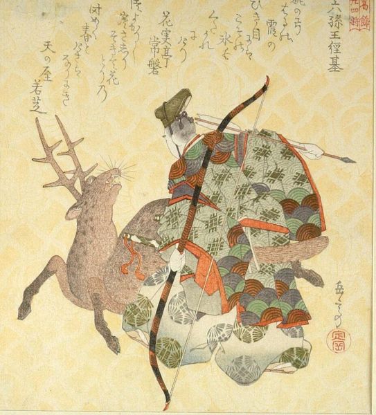 Curator: Isn't it wonderful? This is "RokusonnÅ Tsunemoto" by Yashima Gakutei, part of the series "Twenty-Four Generals for the Katsushika Circle." Editor: Whoa, a general riding a stag? That's intense! It's like a fever dream of power and nature... somewhat awkwardly combined. Curator: Perhaps! This small woodblock print captures a moment of unexpected harmony – or maybe tension. Tsunemoto, a historical figure, becomes almost mythical atop this… vocal deer. Editor: I'm drawn to the patterned robe, that intricate fan design repeating across the fabric. It’s visually calming against the animal's wild energy. Is it a symbol of cultivated control over brute nature? Curator: Absolutely, I believe it represents civilization meeting nature, one trying to tame or communicate with the other. The deer itself, with its antlers reaching towards the heavens, might be a nod to Shinto beliefs, perhaps a divine messenger. Editor: Interesting! So it’s not just about conquering, but also about understanding, or even pleading with the natural world. Food for thought. Curator: Indeed. I'm struck by how Gakutei blends historical portraiture with symbolic narrative in such a compact space. Editor: It's a powerful reminder that even history is filtered through the artist's vision, made personal and provocative.