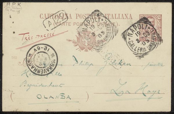Here we see an envelope, part of a correspondence by Vittorio Pica, that features script in ink, stamps and postal markings. At first glance, we are drawn to the delicate cursive, which creates a visual rhythm across the surface, juxtaposed against the rigid geometry of the stamps and seals. The composition here is carefully arranged. The dynamic handwritten script seems to dance around the structured postal information. The eye is led by the lines of the addresses, creating a journey across the materiality of the aged paper. The arrangement of text destabilizes fixed meanings associated with communication. While appearing straightforward in its function, Pica elevates the envelope to an art form, prompting us to contemplate the beauty of everyday correspondence. Consider how this elevates the mundane into the realm of art. It’s not merely about conveying a message, but about the artistry embedded in our daily interactions and materials. By highlighting this we recognize that art doesn't have a singular, unchanging meaning but is a site of ongoing interpretation.