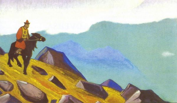 Editor: Here we have Nicholas Roerich's "St. Panteleimon the Healer," and what strikes me first is the sense of quiet humility. The figure is bent over, tending to something small and unseen, set against this vast landscape. What do you see in this piece? Curator: The very image of Panteleimon is laden with historical and cultural weight. Roerich's choice to depict the saint, not in grand iconographic form, but as a humble healer amidst the mountains speaks volumes. The mountains themselves are potent symbols, often representing spiritual aspiration and transformation in Roerich's oeuvre and across many cultures. Consider the symbolism of healing--what does it evoke for you? Editor: A sense of hope, of course. And maybe, the connection between physical well-being and spiritual ascent? Curator: Precisely! Panteleimon wasn't just healing bodies; he was a vessel for faith. The colours too carry symbolic weight. Note the prevalence of blues and purples: colours of spirituality, intuition, and peace, recurring motifs in religious art to depict enlightenment and wisdom. But Roerich's palette veers from traditional icon painting; he presents something more internalized, more personal. This tension contributes to the artwork's captivating, almost dreamlike quality. Editor: That’s fascinating! It’s like Roerich is updating an ancient archetype for a modern, perhaps more secular, world. I really appreciate your insights into how symbols across time play out in this painting. Curator: And I, your keen observation. Remembering how symbols connect us to our collective history helps reveal the depth in any artwork.