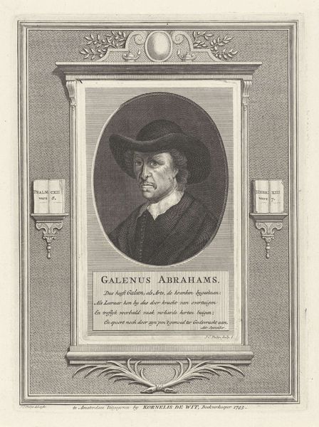 Editor: This is "Portret van fr\u00e8re Jaques de Beaulieu," a print from sometime between 1675 and 1711, currently housed in the Rijksmuseum. The sitter's expression and the starkness of the engraving give it such an unsettling feeling, especially with those words swirling around him. What jumps out to you? Curator: I see a carefully constructed piece of propaganda, really. This engraving participates in a historical narrative, crafting an image of Brother Jaques as both pious and learned, hence the Latin text and scholarly accoutrements. Notice how the surrounding imagery, the background scene with what looks like a hermit’s dwelling, coupled with the prominent display of the sitter's tools, shapes our perception. How do you think this impacts his intended audience? Editor: It positions him as a figure of authority, I guess? Like he's not just anyone; he's connected to something bigger. It's a deliberate act of image-making, aiming to control how people perceive him, or his order. Curator: Exactly. And it’s crucial to understand the political landscape of the time. Religious orders often used portraiture to solidify their position and promote their ideals. This engraving isn’t simply a likeness; it’s a carefully staged presentation intended to cultivate a specific reaction, probably support. Do you think this portrait could also influence how history views him? Editor: Oh definitely. It almost feels like a curated piece of evidence. It makes you question the intent and who gets to tell whose story, right? I never thought about how much power there is in presenting a person through an artwork! Curator: Indeed! These types of artworks underscore how portraits like this one played a vital role in shaping the public image of religious figures. What has this told us about this image's cultural impact? Editor: The cultural context makes it clear: it wasn’t just art for art’s sake; it served a much bigger, socially-motivated function.