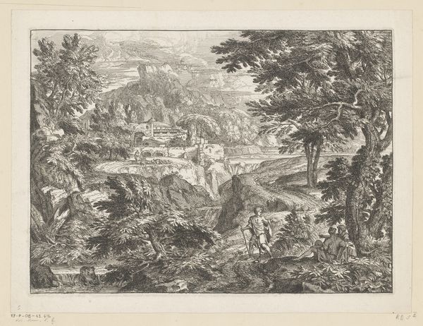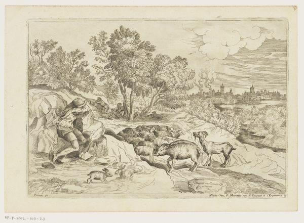 Editor: Here we have a print, an engraving to be precise, titled "Landscape with the Repentant Saint Jerome and Three Resting Lions" dating from about 1663 to 1726 by Moise Jean Baptiste Fouard. The stark contrast really creates a dramatic, almost theatrical mood. What do you see in this piece? Curator: Well, immediately the prominence of Saint Jerome draws the eye, kneeling near the left of the engraving. Yet, what truly resonates is the layered symbolism within the animals and landscape. Do you notice anything interesting about the lions, specifically their rest? Editor: I see the three lions relaxing, maybe one's sleeping? But what's striking is their calmness amidst such a rugged environment, almost as if they're tamed or at peace. How does that play into the cultural memory you mentioned? Curator: Precisely. The lion is a multifaceted symbol. Royal power, strength, but also, in the context of Saint Jerome, repentance and transformation. His act of removing a thorn from a lion's paw led to companionship. It signifies how even wild, formidable forces can be subdued by compassion and humility, resonating across cultures through stories and shared morals. Notice also that above Jerome is an image of a person flying or falling from the sky? Any ideas what this means in relationship to Jerome? Editor: Perhaps, his soul reaching enlightenment, and the lion helping guide his way. Curator: Precisely! Editor: It’s incredible how one image, through its symbolic language, can speak to shared human experiences of redemption and harmony. Curator: Indeed, revealing the enduring power of visual symbols to communicate across centuries.