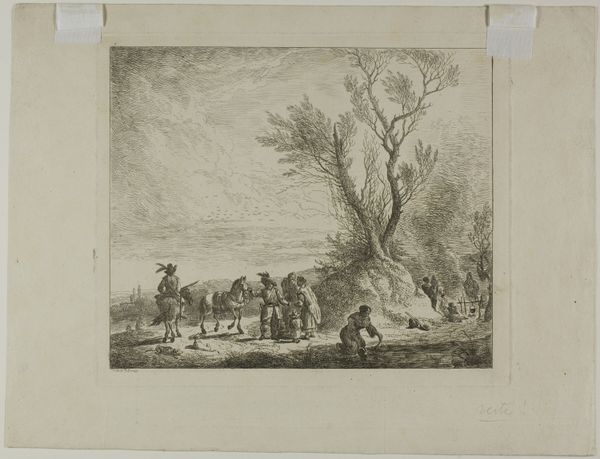 Curator: This intriguing sketch before us is "Bivak van Kozakken, 1813," or "Cossack Encampment," rendered in pen and ink by Pieter Bartholomeusz. Barbiers. It resides here in the Rijksmuseum. Editor: It has the aura of captured moment, doesn't it? A group of figures huddled around a fire, their forms fading into the dusk—it evokes the vulnerability of displacement, but with a touch of camaraderie. Curator: The setting indeed speaks volumes. The piece dates from 1813. We need to remind ourselves of the context; Europe was aflame with the Napoleonic Wars, and Cossack regiments were then very active across the continent. Barbiers has seized a scene of daily life for these itinerant soldiers. Editor: Yes, there’s a casual air, almost like an accidental photograph, as if the artist just happened upon this encampment while sketching in his journal. This naturalism feels particularly pointed given the Romantic style prominent at the time. I find that incredibly interesting. Curator: And did you notice the light pencil work? This wasn’t designed for display, in my opinion. Barbiers appears more intent on a record for himself, almost anthropological in approach. He's showing us not just Cossacks, but people making the best of difficult circumstances. Editor: It's definitely intimate and compelling because of that casual quality, but it would be short-sighted to assume there aren't issues around cultural appropriation present in the piece. How much did Barbiers know, truly understand, about the individuals that he chose to document? What were their views, and lived experiences, amid those wars? These Cossacks certainly have no voice within Barbiers's landscape. Curator: That tension, between observer and observed, gives it depth. Art is never truly neutral, is it? The artist is, after all, making deliberate aesthetic choices that frame the narrative in ways that could easily erase more difficult facts. That’s what makes the piece worth contemplating. Editor: Exactly. By pulling back layers of cultural context and history, the Cossack figures solidify from forms into figures. It goes beyond just a simple recording. This work reminds us to always consider whose stories are left unheard.