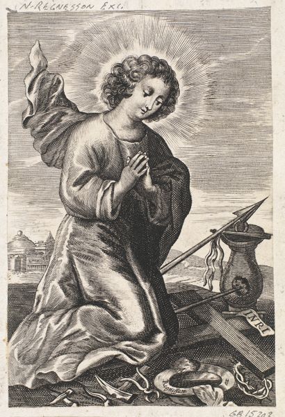 Curator: This is a piece called "Heilige Barbara," or Saint Barbara, an engraving made sometime after 1626, now residing here at the Rijksmuseum. It's unsigned, so we attribute it to an anonymous artist. Editor: Oh, she has a serene aura! Very graceful, regal, but something in her eyes feels almost melancholic. Is that a tiny castle she's holding? I adore how everything is rendered with such exquisite detail despite the monochromatic palette. Curator: Indeed, she is depicted holding a miniature tower, one of her identifying attributes, a reference to her imprisonment. Note also the palm branch, symbolizing victory over her persecutors. Editor: Victory in melancholy, it seems. Knowing a bit about art history and the narratives artists chose to portray back then, you sort of already know something terrible is about to befall this person. The way the lines create a halo effect around her feels significant... and also, frankly, a bit eerie. Curator: You've picked up on a few important cultural associations. Prints like these served devotional purposes, circulating stories of saints like Barbara and their significance in religious belief. The tower emphasizes her strength of faith in the face of confinement and, ultimately, martyrdom. It represents her conversion to Christianity. Her father locked her in a tower to protect her from outside influences. Editor: The social pressures were quite a different monster then! And her quiet resolve really speaks volumes. It's a delicate etching, but she has quite some power to hold the attention still, even now. I think there is something touching about these objects they hold and are known for, such personal association. I wonder what the one thing people would remember me by would be? Curator: I agree, the artist has masterfully captured that inner strength. What seems particularly compelling, when you start to research its significance at the time, is how actively such printed works like these helped promote Barbara as an intercessor, especially for protection against sudden death and dangers involving fire, lightning, or explosions—patronage by miners, armourers and artillerymen ensued! It's interesting to think about its role in solidifying particular religious and cultural traditions. Editor: Definitely! Well, it's made me want to run home and construct a personal iconography to try out, even if my "thing" turns out to be a bit silly. Thank you for these artful, social coordinates; these types of considerations do shift the experience quite significantly. Curator: My pleasure; thank you for bringing it to life from a personal perspective. I hope that our conversation has offered everyone insightful perspectives to consider regarding this engraving, "Heilige Barbara."