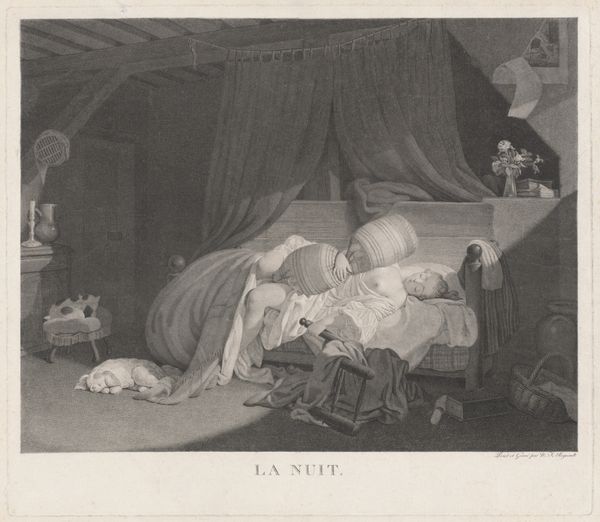 Thomas Rowlandson created this etching, entitled ‘Slaapkamer met ratten die de pruik van Doctor Syntax opeten,’ using etching. The composition directs our eyes through a series of contrasts: light and dark, open space and enclosure, chaos and order. Rowlandson masterfully divides the scene, using a stark contrast in lighting to draw attention from the shadowed background into the brightly lit foreground where the drama unfolds. The angular lines of the room's architecture are juxtaposed with the frenzied movements of Doctor Syntax and the rats, creating a dynamic tension. This arrangement evokes a sense of unease, disrupting the viewer's expectations of domestic tranquility. The beams of light and shadow play with our perception, questioning the stability of the scene. The asymmetry challenges fixed meanings and engages with new ways of thinking about space. The stark illumination not only highlights the immediate action but also underscores a broader commentary on vulnerability and the disruption of order. As such, this piece invites continuous interpretation.