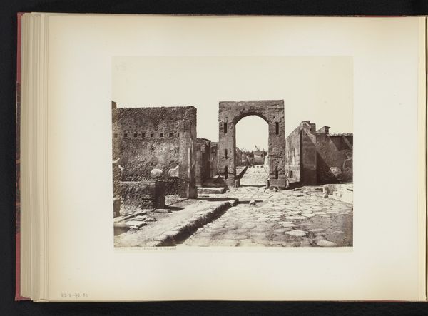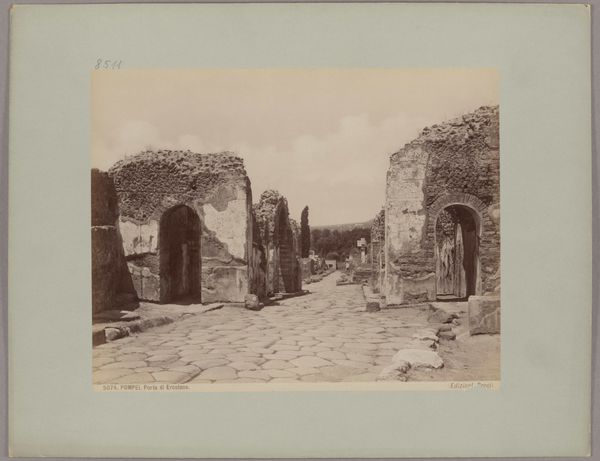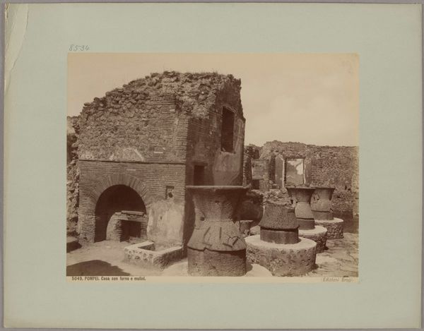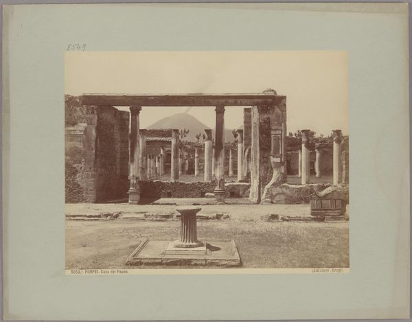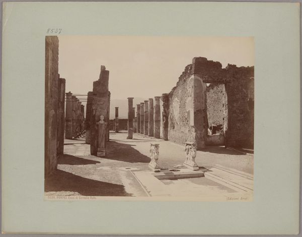 Editor: This is a photograph by Giacomo Brogi, taken sometime between 1880 and 1890, of the House of Marco Lucretius in Pompeii. It's an albumen print, sepia toned, capturing a quiet, almost ghostly ruin. What do you see in this piece? Curator: What strikes me is how this photograph invites us to contemplate the persistence of symbols across time. Look at the sculptures and architectural fragments. They were laden with meaning for the Romans, reflecting their beliefs, values, and power structures. Brogi's lens captures not just a physical space, but also a cultural memory. How do these images resonate with us today, do you think? Editor: Well, seeing these ruins does evoke a sense of history and the passage of time, of course. It makes you think about how civilizations rise and fall, and how their stories are preserved or lost. Is there something particular about this house, or these specific symbols, that might have stood out to viewers in the late 19th century? Curator: Absolutely. Pompeii, rediscovered only a century before this photograph was taken, became a powerful symbol of the classical world and a tangible connection to antiquity. The house itself, with its preserved art and architecture, offered a glimpse into Roman domestic life and ideals. The statue becomes an echo of its original form, and stands at the edge of an abyss, of history lost and then found. What kind of cultural baggage does an artwork carry as an echo in time? What did it once signify? What might it represent in a century? Editor: That makes a lot of sense. So, Brogi's photo isn't just documenting a place, but also engaging with the Victorian era's fascination with the classical world and with this concept of rediscovering ancient cultures? Curator: Precisely! He’s leveraging the inherent symbolic weight of Pompeii to evoke a sense of wonder, loss, and the enduring power of the past. Photography becomes a medium through which the ancient world can be made present, a shared cultural touchstone. This wasn’t merely a landscape image, it was a vessel of collective memory. Editor: I never thought about it that way! Thanks for showing me how this photograph is much more than just a record of a place; it's a doorway into understanding how different eras connect through images and shared cultural understanding. Curator: Indeed! The image is an example of how the symbols shift, reform, and get reshaped throughout history. Art provides a continuity of the symbols of our collective human consciousness.