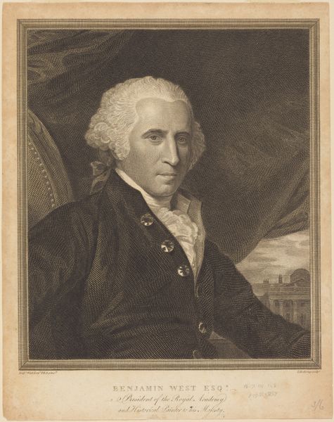 Curator: Gilbert Stuart's portrait of Benjamin West, painted during West's tenure as President of the Royal Academy, presents a study in restrained elegance. The dimensions are approximately 89.5 by 69.8 centimeters. Editor: My first impression is one of cool detachment. The palette is muted, and West’s gaze avoids direct engagement, suggesting the aloofness often associated with positions of power in a patriarchal society. Curator: Indeed, the composition reinforces this. Note the subtle triangulation, leading the eye from his face down the line of buttons on his waistcoat, a visual anchor of authority. Editor: And the context! West, though American-born, profited immensely from the British imperial project, mentoring artists who glorified colonial expansion. How complicit was he? Curator: His success, however, depended on mastery of painterly techniques. Observe the rendering of textures – the sheen of silk, the softness of the ruffled cuffs. It’s technically brilliant. Editor: Brilliant, perhaps, but also a visual representation of privilege maintained through systemic inequalities. Can we truly separate aesthetics from ethics when looking at such a portrait? Curator: Stuart clearly intends to portray West as a figure of established authority through these visual devices. Editor: And examining those devices through the lens of history, race, and coloniality, makes us ask: whose authority? Curator: A potent point. I'm left contemplating the artist's technical skill versus the loaded historical context of its subject. Editor: Right. Reflecting on how images like these worked, and still work, to reinforce power structures is essential.