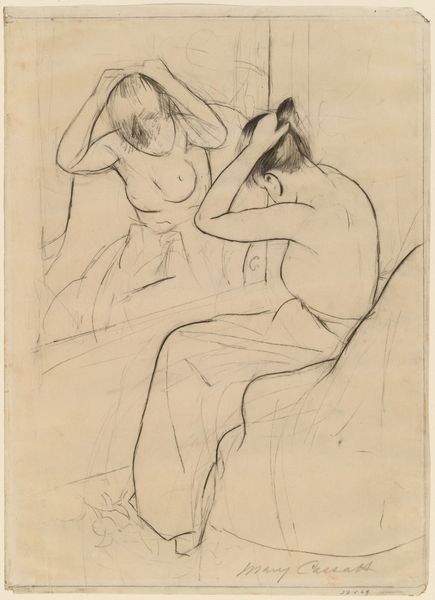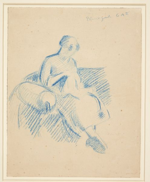 Curator: This subtle drawing, by Charles Martin, captures a seated woman in pencil on paper, currently residing in the Tate Collections. Editor: The initial impression is one of quiet introspection. The delicate lines and muted tones evoke a sense of stillness and contemplation. Curator: Considering Martin's era, how might this portrayal speak to the roles and expectations of women at the time, confined within domestic spaces? Editor: The composition directs us to her posture, head bowed, conveying a certain resignation, but the loose, unfinished lines suggest an interiority beyond what is immediately visible. Curator: The materiality of the sketch itself—the artist's hand evident in each stroke—adds a layer of intimacy, blurring the lines between observation and empathy. Does it challenge traditional power dynamics? Editor: I see in the hatching and the negative space a concern with rendering form, and also with the very act of seeing, the artistic gesture itself. Curator: Perhaps we've each found a thread, a different perspective, revealing the enduring power of a simple sketch to provoke complex questions. Editor: Indeed. It demonstrates how the most subtle arrangement of line can suggest entire worlds of feeling.