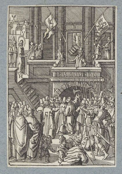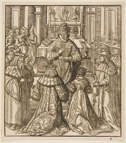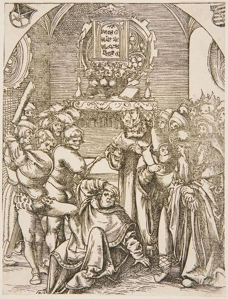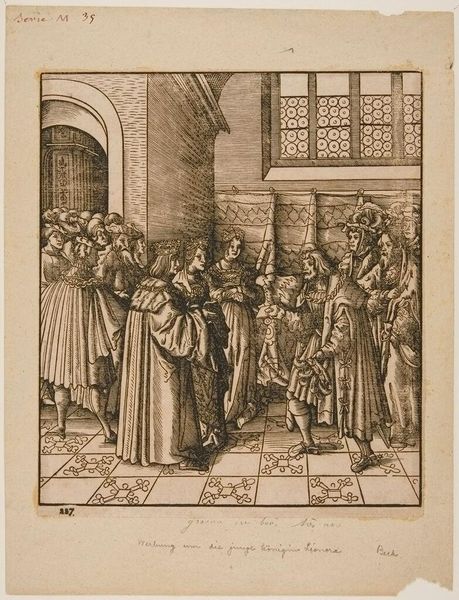 Editor: Here we have Leonhard Beck's "Funeral of the Wife of the White King," a somber scene rendered in ink on paper. The sheer number of figures is striking. What can you tell me about this print? Curator: Look at the repetitive, almost industrial quality of the lines. Consider the labor involved in producing multiple impressions. This wasn't just about aesthetics; it was about disseminating a message widely. Who was meant to see this? Editor: Perhaps a specific social class? The "White King" implies royalty. Curator: Precisely. The print medium allowed for controlled distribution of imagery, shaping perceptions of power and mourning rituals within a specific social strata. What does that say about the function of art here? Editor: It’s more than decorative; it's a tool for social messaging and control. I hadn't considered the impact of mass production on its meaning. Curator: Exactly. The materiality of the print reveals its active role in shaping social and political landscapes.