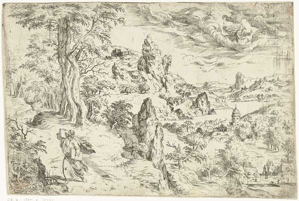 Editor: This is "Landscape with the Sacrifice of Isaac" by Hieronymus Cock, created in 1551. It looks like an ink drawing. The scene is quite dramatic, a landscape looming over the almost-sacrifice, but I am really drawn to the materiality of the work, the clear evidence of labor. What’s your interpretation? Curator: Indeed. I find it helpful to consider the pen and ink as crucial actors here. The labor-intensive process of creating these meticulously detailed lines was central to conveying not only the image but the theological concepts of obedience and sacrifice to an emerging public audience. The distribution network that made Cock a leader is critical. What do you make of the landscape itself? Editor: It seems less of a backdrop and more like another character, looming, indifferent even, with all those sharp cliffs and twisted trees. So, is the landscape meant to reflect something about the economics or socio-political climate of the time? Curator: Precisely! Think about the raw materials - ink and paper. Where did they come from? Who produced them? Consider the labor involved in not only the artist’s hand but the manufacturing of the medium itself. How does that influence our perception of this religious narrative? Editor: So, by examining the production and availability of these materials, we gain insight into the broader culture of the 16th century? It isn’t just about the subject, it is about the means of representation, who could participate and consume art like this. Curator: Precisely. Understanding that this drawing wasn’t just a personal creation but part of a larger industry reshaping cultural and spiritual consumption provides a richer, more material understanding of the artwork's historical weight. Editor: I've always looked at art for beauty or emotion. I had never really considered what it was made of. This gives me a different framework. Curator: The world remakes our media, as we remake the world!
