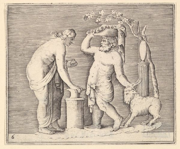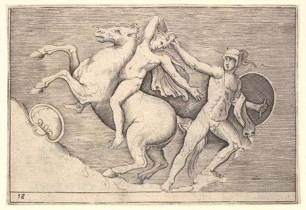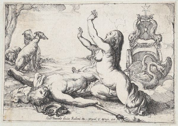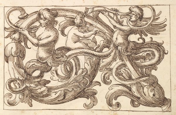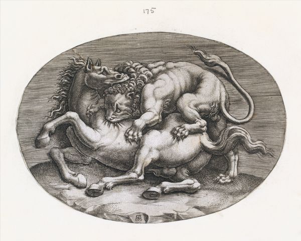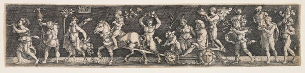 Curator: Good morning. I'd like to draw our attention to an intriguing engraving, attributed to an anonymous artist, dating between 1599 and 1622. It is titled "A Belted Pig and Two Cupids (or Geniuses) with a Butterfly (or Moth)," part of the series "Ex Antiquis Cameorum et Gemmae Delineata." Editor: My immediate impression is one of peculiar juxtaposition. A stout pig in a harness casually strolls above two struggling cherubs and a rather imposing vegetable – is that a carrot they're wrestling? Curator: Indeed. The "belted pig," which appears to be collared as well, could be interpreted in several ways. Pigs were often associated with gluttony, but a belted or harnessed pig may signify restraint, discipline or even luxury, being literally "well-kept." Editor: That tension between wild appetite and controlled indulgence is definitely palpable, especially in the context of these fleshy cupids straining against, well, what *is* that? It does look like a large root vegetable. I am struck by its slightly absurdist quality. How would a 17th-century audience react to the animal wearing harness like that, as some form of bizarre mascot of prosperity and discipline, as the age of exploration shifted toward the grand courts? Curator: Perhaps they'd appreciate the allegorical quality—the Mannerist style embraced symbolism, playing with contrasts to stimulate thought. The putti represent divine love while fighting what might be interpreted as a phallic object representing fertility. The insect hovers over all like fleeting time. It could underscore human existence's balance between earthly pleasures and spiritual pursuits. What do we learn by putting together different meanings together here? Editor: I think the composition's visual tension creates social critique. It highlights contradictions inherent in elite displays of wealth and self-control. The pig, burden and wealth become strange symbols. Curator: So it reveals social tension. Editor: Yes! Curator: I agree. A seemingly straightforward image, full of hidden symbolism. This piece captures so much of its time—the lavish display of status through morality's lenses, interpreted through very carefully selected figures. Editor: The picture definitely shows something unique: The visual conversation reminds me again how relevant the analysis of such art pieces are, revealing the contradictions inherent in the human experience.
