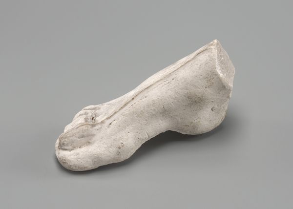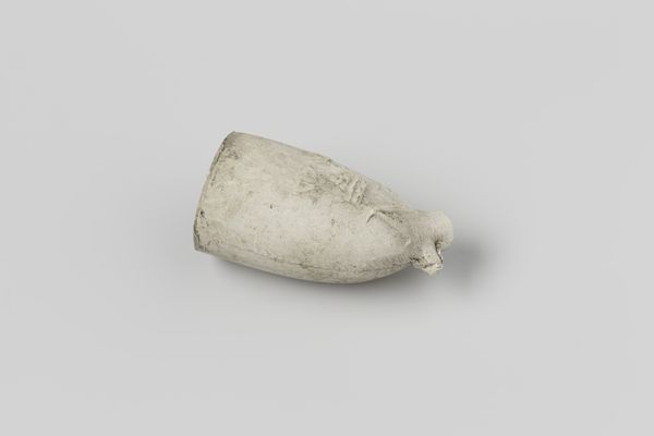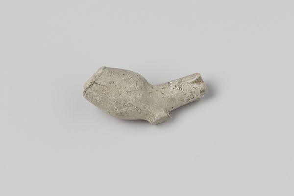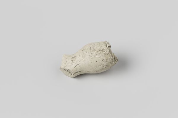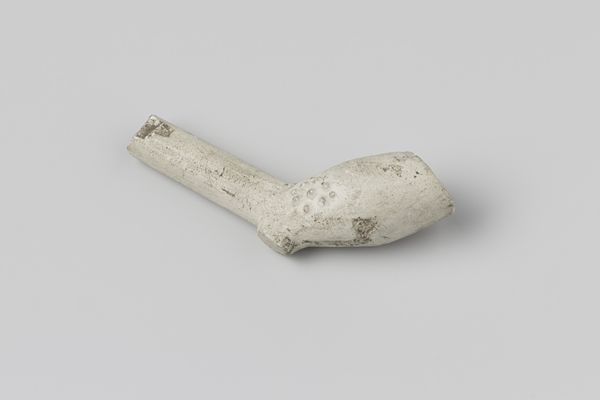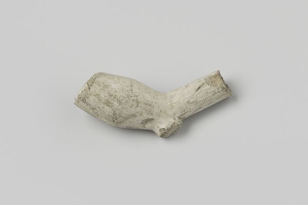 Editor: Here we have a fragment of a tobacco pipe, made from earthenware sometime between 1630 and 1660. Even in its incomplete state, there’s a lingering sense of its use, a kind of ghostly pleasure perhaps. What do you make of this humble object? Curator: Indeed, it is humble, but think about the complex journey of tobacco, its initial ritualistic use among indigenous populations and its later appropriation as a global commodity. This fragment embodies that history. Editor: So it's less about the pipe itself, and more about what it represents? Curator: Exactly. The pipe, particularly in this broken state, speaks volumes about trade, cultural exchange, and even addiction. Look at the bowl shape; what does it remind you of? Editor: I guess, in a strange way, a human skull. Are you suggesting there’s some connection there, maybe a reminder of mortality? Curator: Precisely. Consider also the color, a kind of ghostly white. Smoking, though pleasurable, has a shadow side. Pipes like this could well have been decorated; perhaps those designs were charged with symbolic meaning now lost to us, lost like the rest of this fragile clay object. Editor: So even in its broken form, it's communicating all this history and cultural significance. Curator: Absolutely. Even fragments can be powerfully evocative. It triggers us to consider complex cultural histories of pleasure and death. Editor: I never thought I could find so much to read in a broken old pipe! Curator: History is hidden in plain sight, once you learn how to look!
